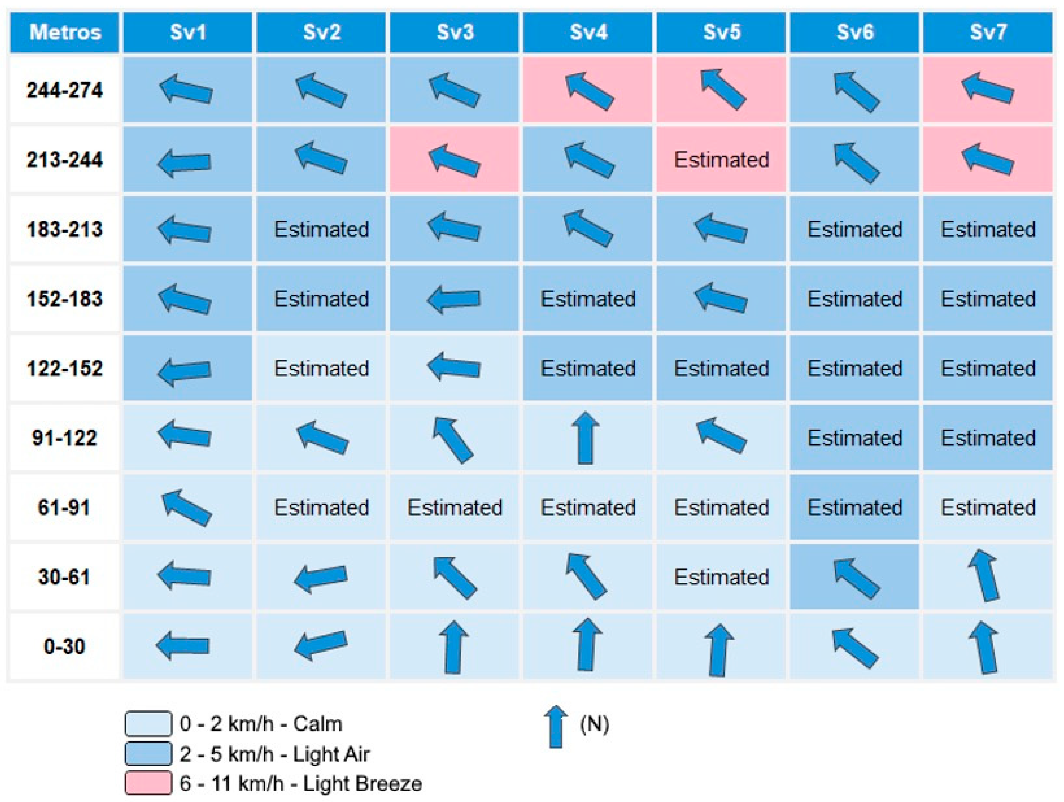 Figure 8 summarizes the vertical profiles of wind speed and direction from the UAV measurements, highlighting the low wind speeds and gentle easterly flows.