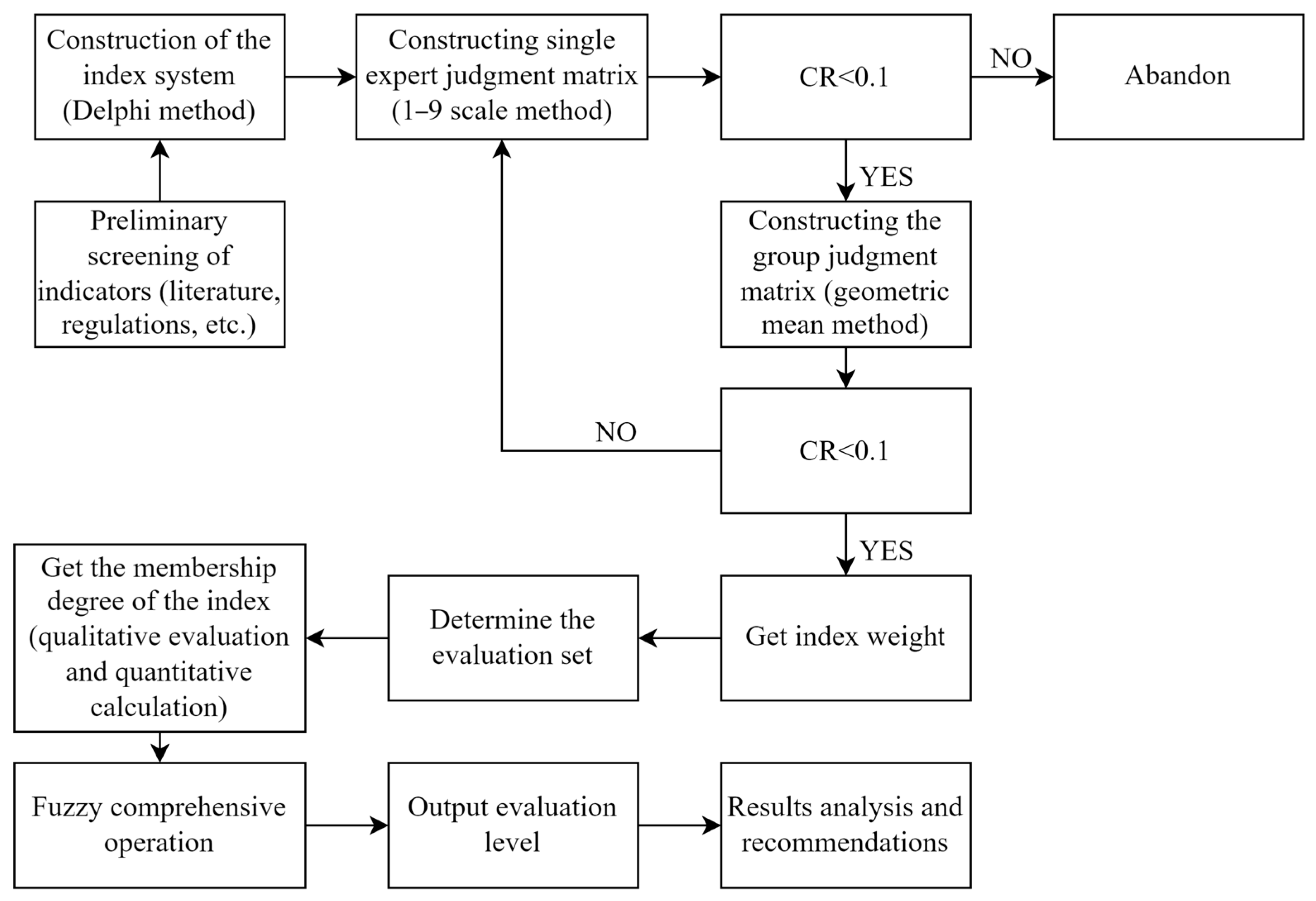 , which means that the constructed judgment matrix meets the acceptable consistency standard, and the weight can reflect the true importance of the index; if the consistency requirement is not met, it means that the consistency of the judgment matrix is questionable. The judgment matrix requires readjustment until it successfully passes the consistency test. All indicators are weighted and tested for consistency according to this process, and the results are shown in
