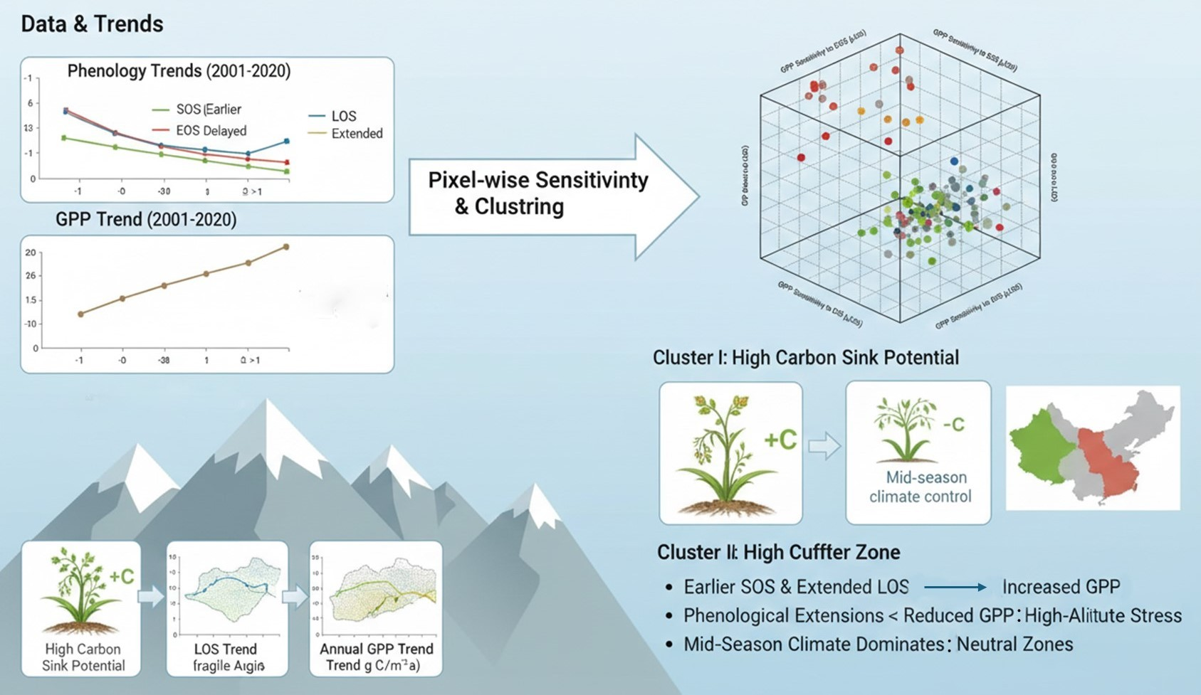 Building on pixel-wise sensitivity analysis of GPP to SOS, EOS and LOS, we constructed a three-dimensional phenology–GPP sensitivity space and applied k-means clustering to classify grassland ecosystems into three functional response zones—areas of high carbon sink potential, ecologically fragile regions and neutral buffers. Compared with previous studies that mainly described large-scale correlations between phenology and productivity, this sensitivity-based functional zoning framework explicitly captures how strongly and in which direction GPP responds to phenological shifts at the pixel scale. The resulting functional zones exhibit distinct phenology–productivity coupling patterns shaped by the combined influence of topography, climate variability and ecosystem resilience, and reveal the complex, spatially heterogeneous nature of phenology–carbon interactions in an ecological transition zone that has been underrepresented in earlier work.