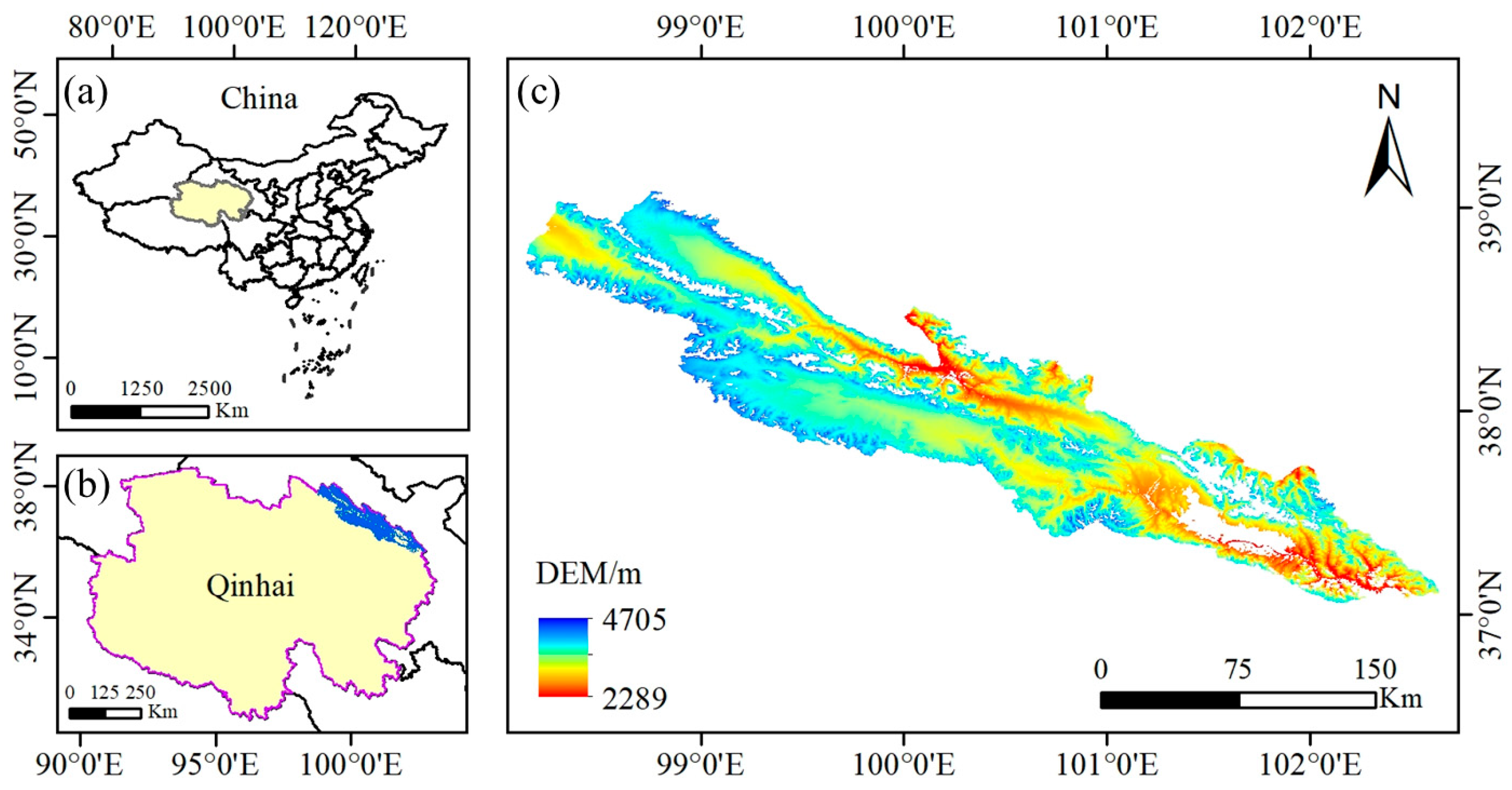 The southern slope of the Qilian Mountains is located at the northeastern edge of the Qinghai–Tibet Plateau (98°08′ E–102°38′ E, 37°03′ N–39°05′ N), covering an area of approximately 24,000 km