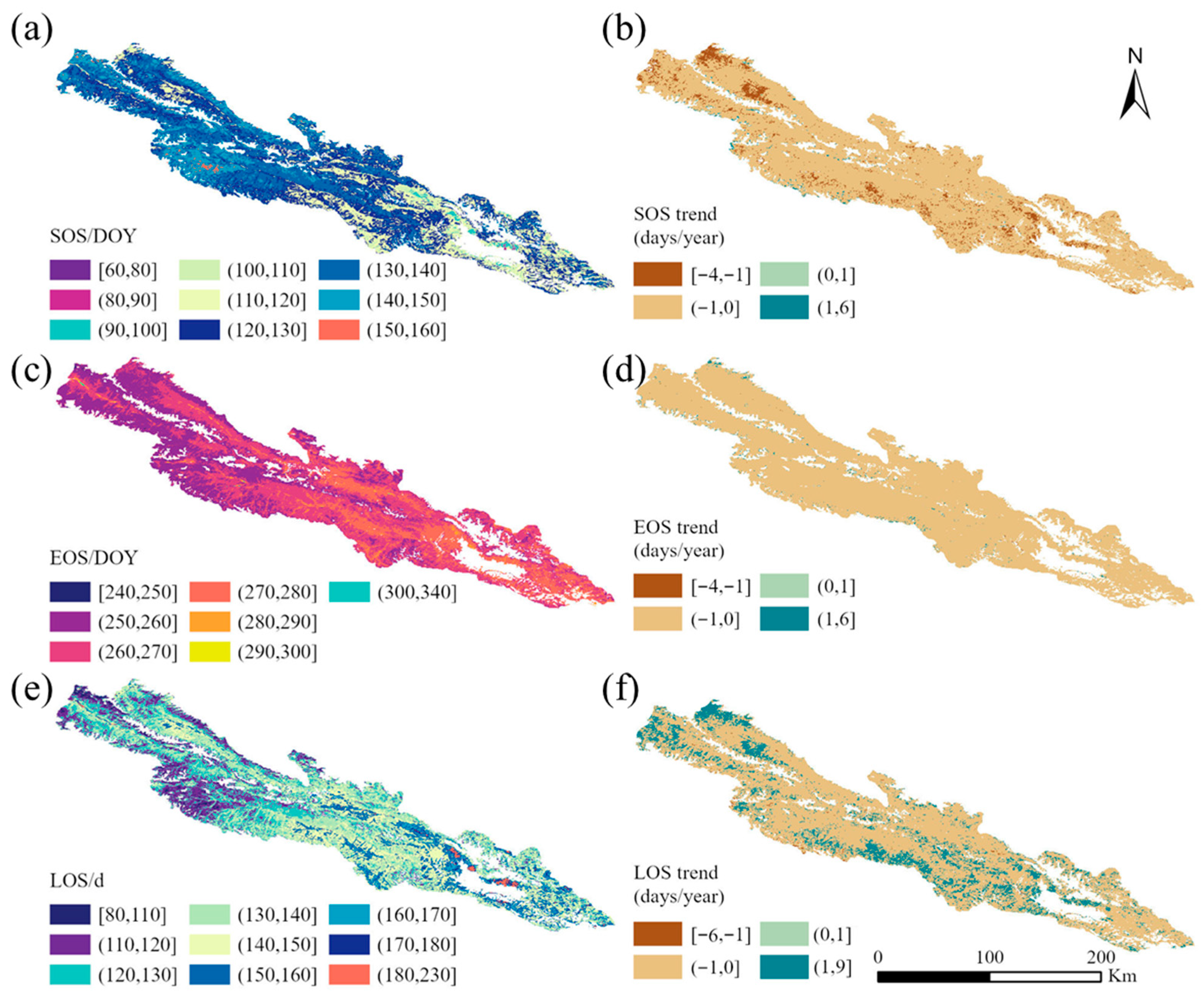 In recent years, substantial efforts have been devoted to characterizing vegetation dynamics over the Qinghai–Tibet Plateau using long-term MODIS time-series data. For example, Qi et al. analyzed the spatial–temporal variations of vegetation phenology in the Qilian Mountains and highlighted the roles of snow cover and elevation in regulating SOS and LOS [