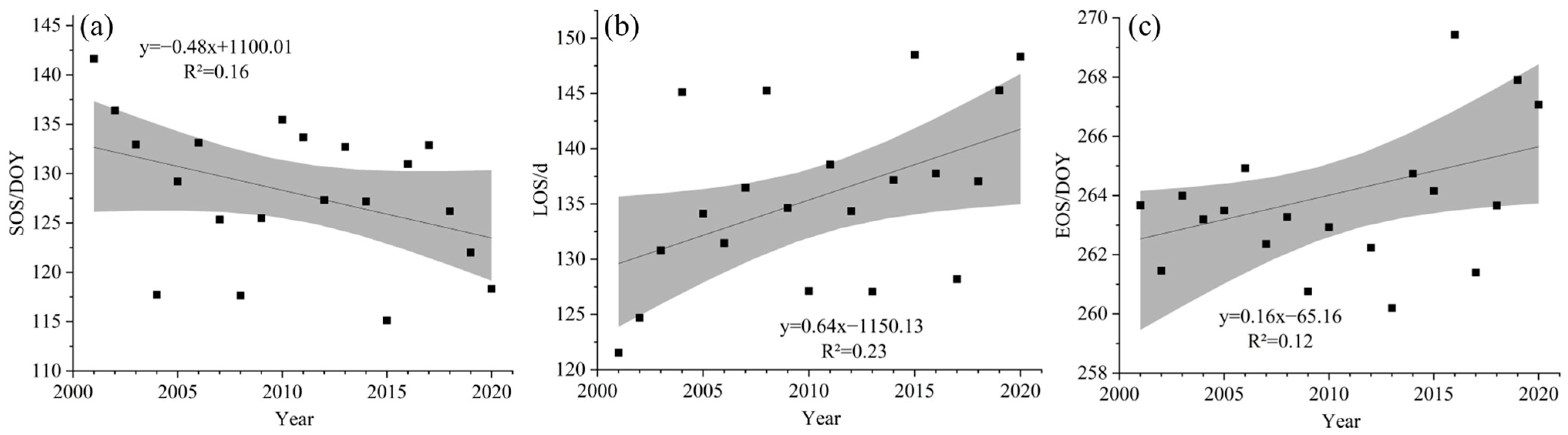 65]. Similarly, delayed EOS and increased LOS enhance GPP in some regions, as autumn extensions allow continued photosynthetic activity, contributing to carbon uptake, which is corroborated by studies on the Tibetan Plateau [