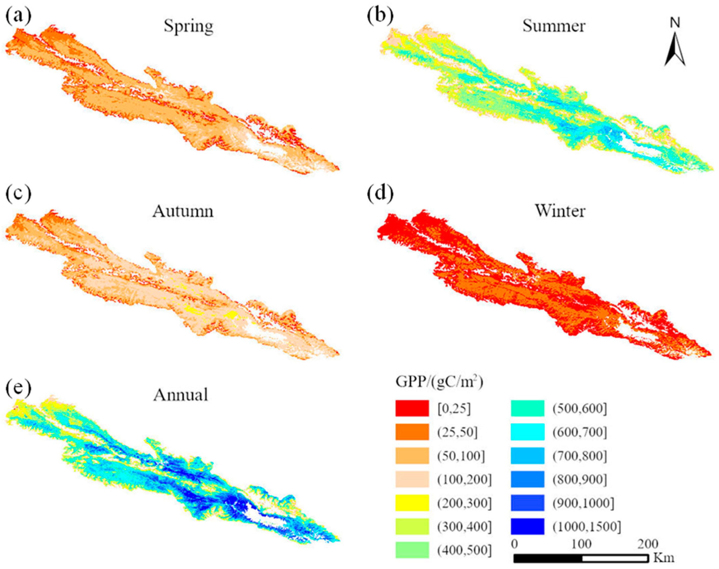 GPP showed pronounced seasonal variability, with summer contributing the highest values, followed by spring and autumn, and the lowest values observed in winter. During summer, abundant solar radiation and favorable hydrothermal conditions enhanced photosynthetic activity, making it the peak season for carbon fixation. The spatial distribution of summer GPP mirrored that of the annual average, also showing a southeast-to-northwest decreasing trend. Spring and autumn GPP patterns were generally similar, with multi-year averages of 62.5 g C/m2/a and 96.3 g C/m2/a, respectively. In winter, GPP approached zero across most of the region due to average temperatures falling below 0 °C, which suppresses photosynthesis.