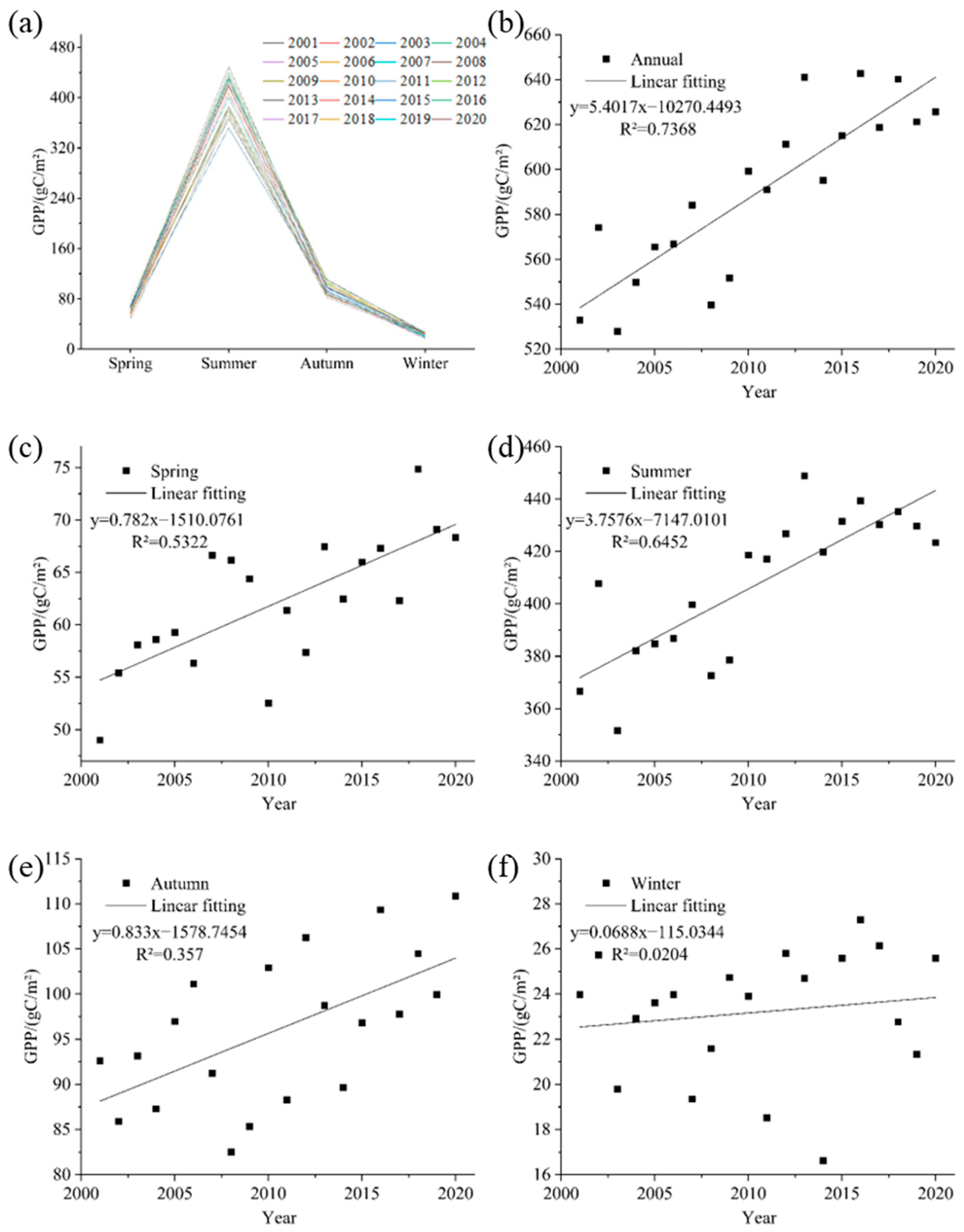 2/a. All four seasons exhibited increasing GPP trends, with the most substantial growth in summer (3.8 g C/m