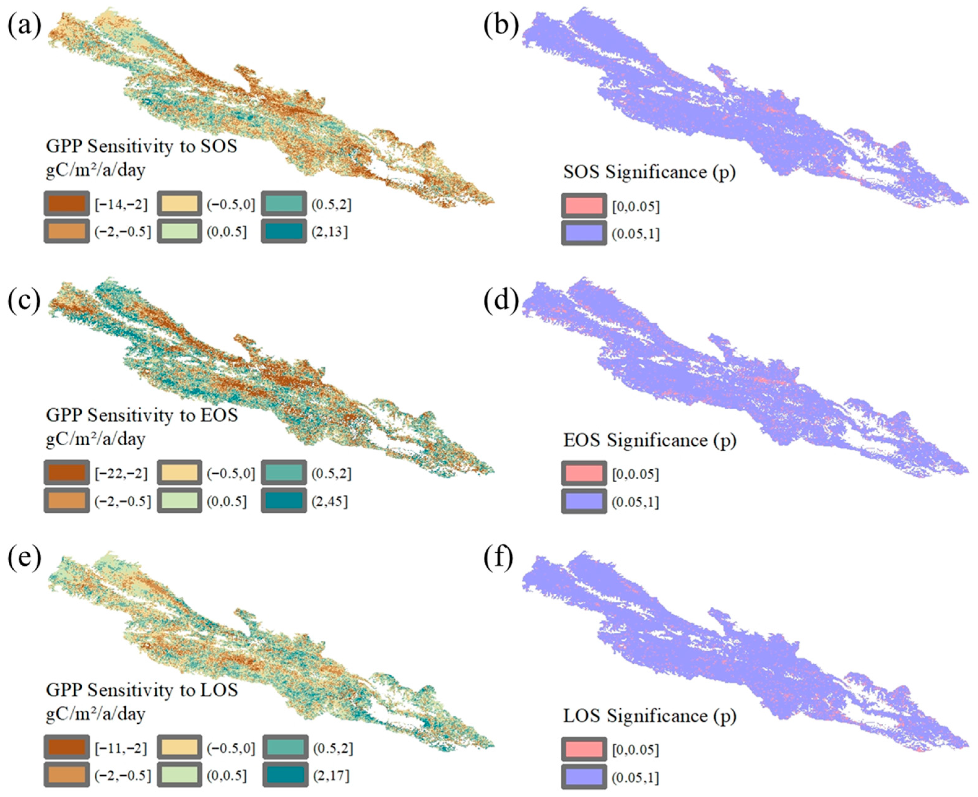 This study developed pixel-scale linear regression models to evaluate the sensitivity of GPP responses to SOS, EOS, and LOS. The results reveal that these phenological metrics exert distinct effects on GPP, indicating spatial heterogeneity. Specifically, earlier SOS generally has positive effects on GPP, as earlier green-up enables an extended photosynthetic window and enhances early-season biomass accumulation. This aligns with findings that earlier spring phenology increases vegetation NPP through extended growing seasons [