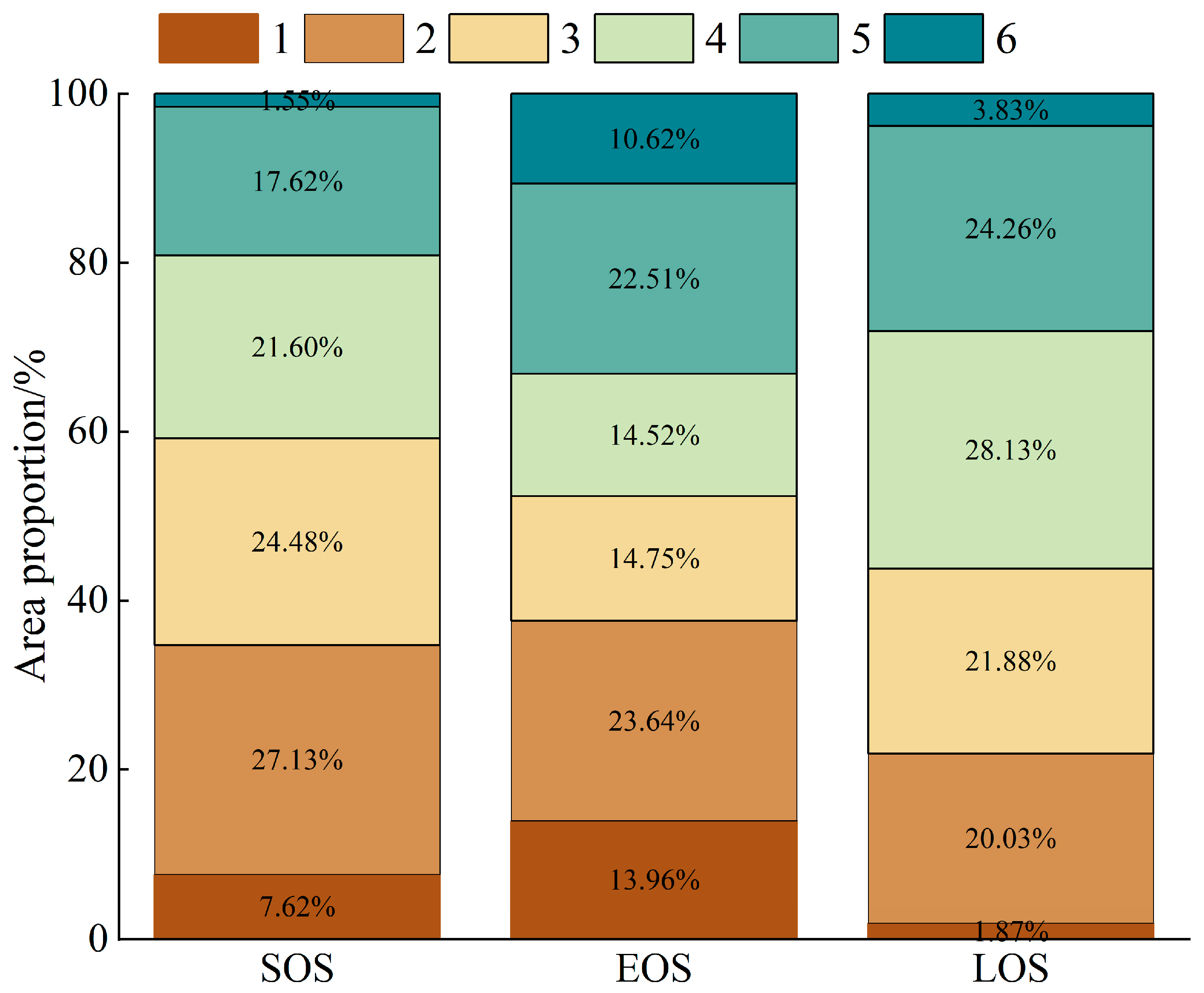 18]. Therefore, a dynamic threshold method was adopted in this study to extract SOS, EOS, and LOS, aiming to improve the flexibility and accuracy of phenological parameter extraction [