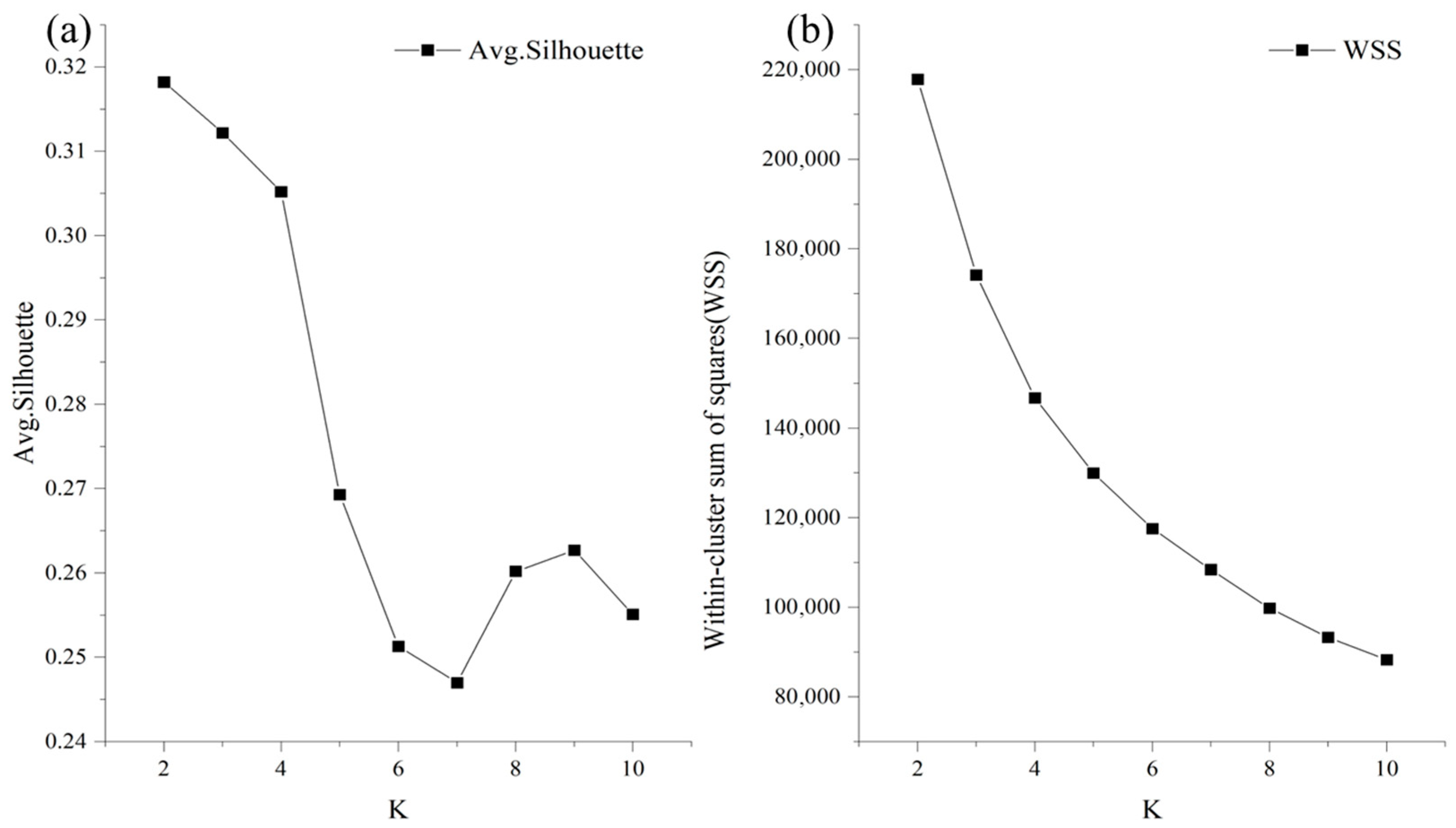 53]. The Elbow method involves plotting the Within-Cluster Sum of Squares (WSS) against different K values and identifying the “elbow” point where the rate of decrease sharply changes, signifying an optimal number of clusters [