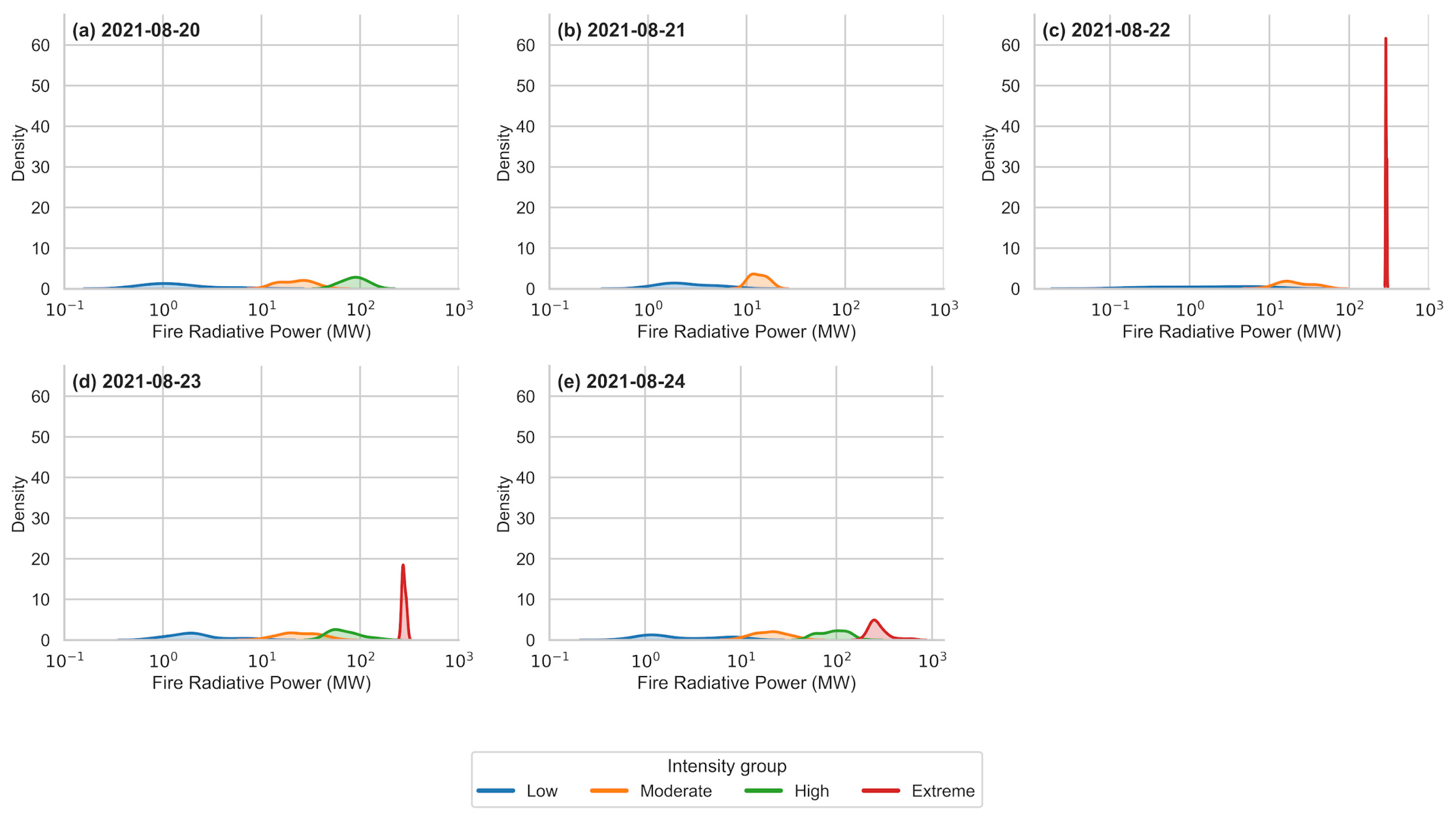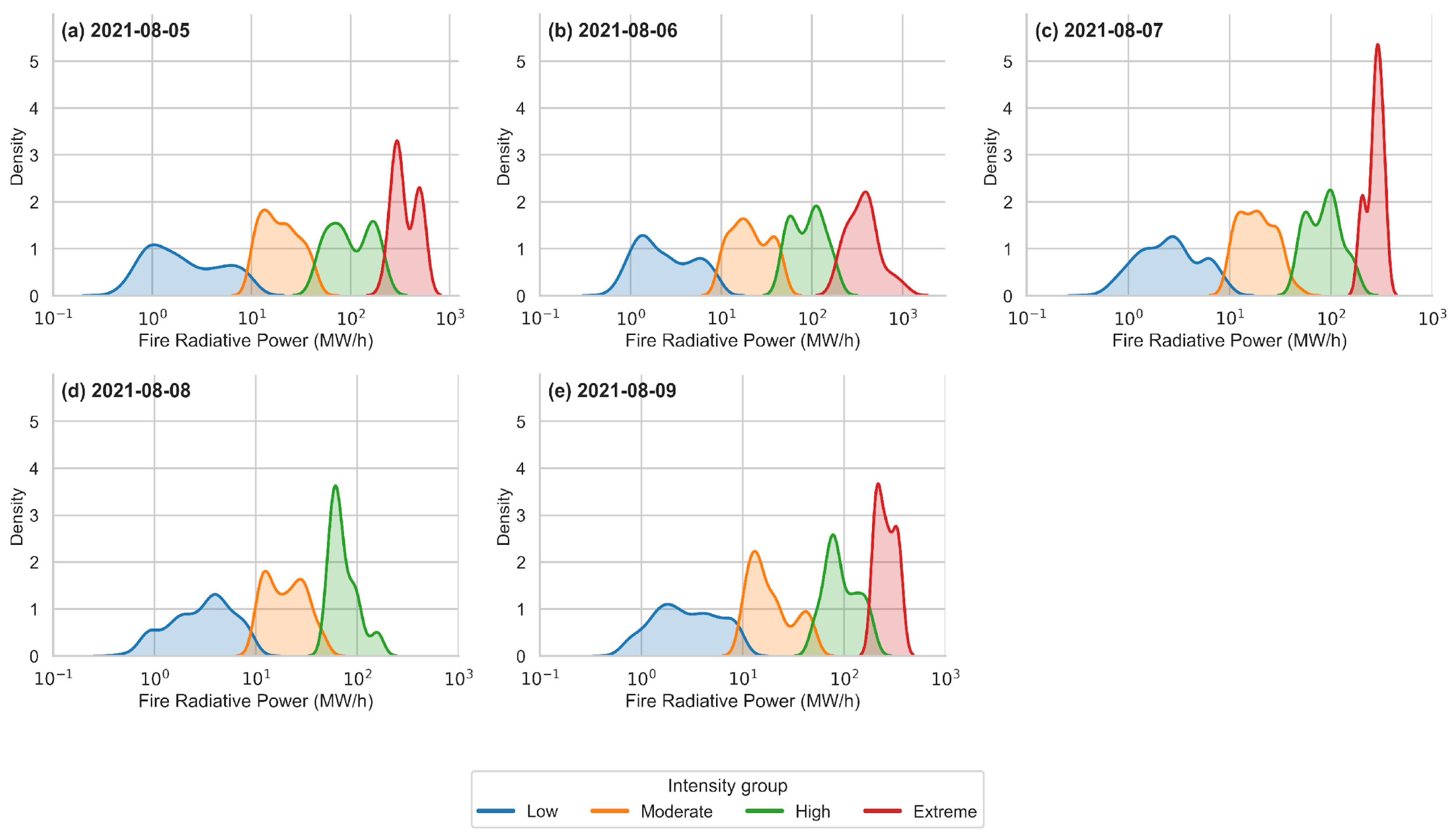 | Fire Radiative Power (FRP) | VIIRS | Suomi NPP/NOAA-20 (FIRMS) | August 2021 | Quantification of fire intensity |