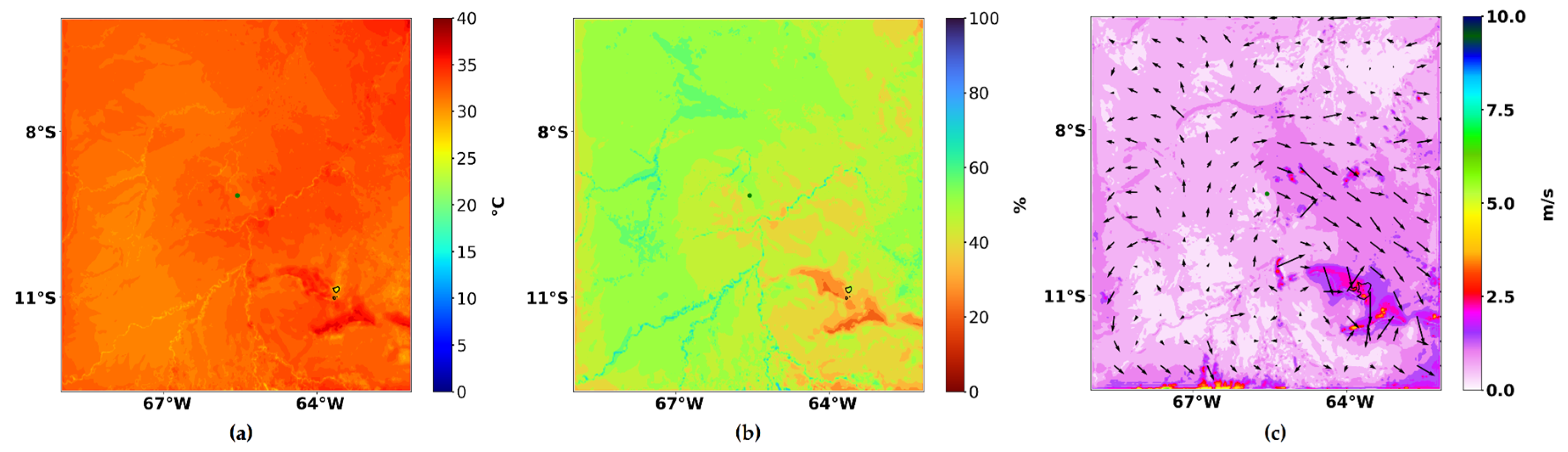 | 850 hPa (Lower Troposphere) | Low (<10 m/s) | Without a predominant direction | Calm low-level conditions provided limited mechanical forcing. Fire heating may contribute in reality, but in Meso-NH the plume effects are not considered, with simulation reflecting only atmospheric stability and wind field. |