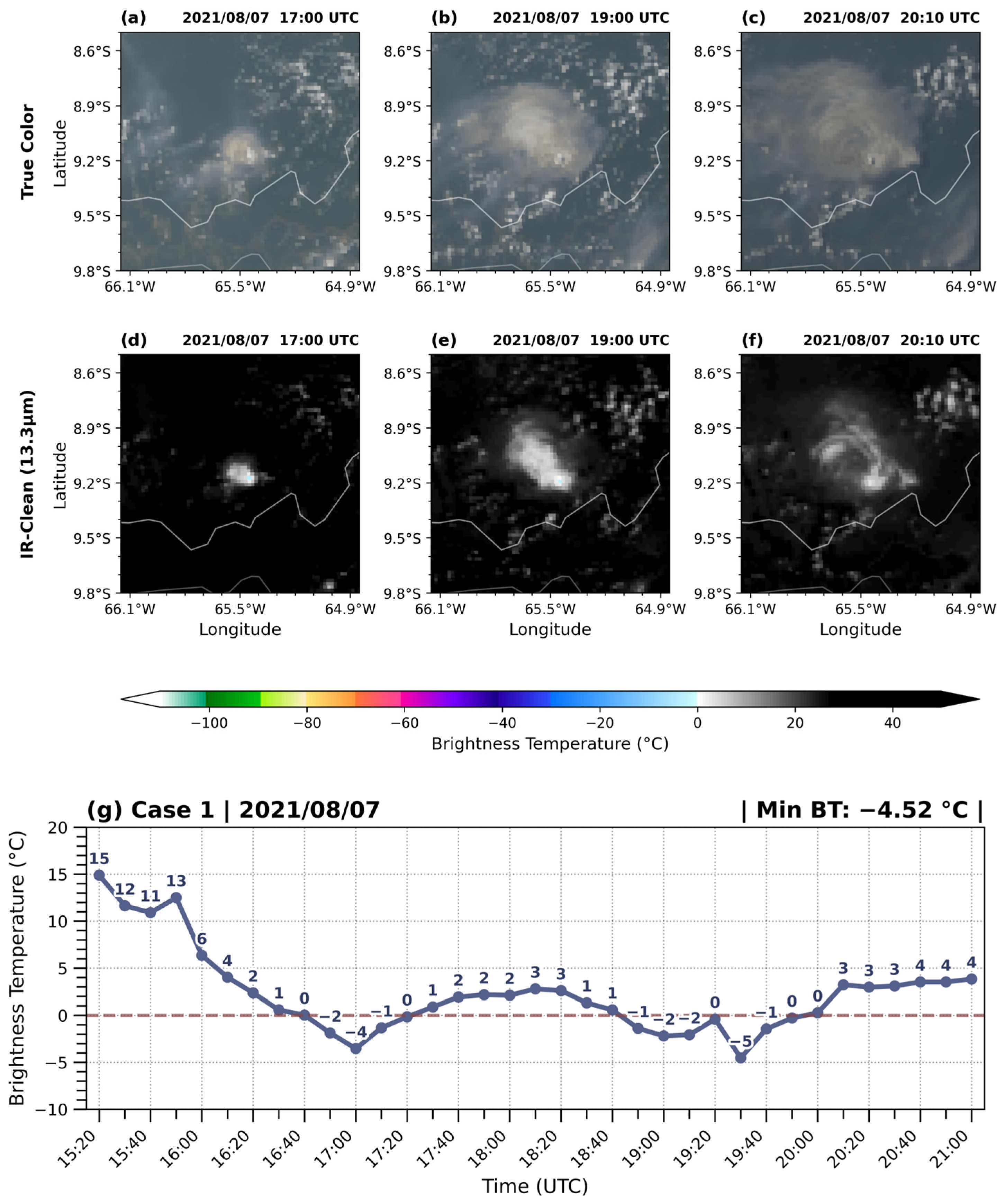 | Infrared imagery (CH13) | ABI (Channel 13) | GOES-16 | 7 August 2021 (16:00–19:00 UTC); 23 August 2021 (16:10–20:10 UTC) | Identification and evolution of pyro-convective clouds |