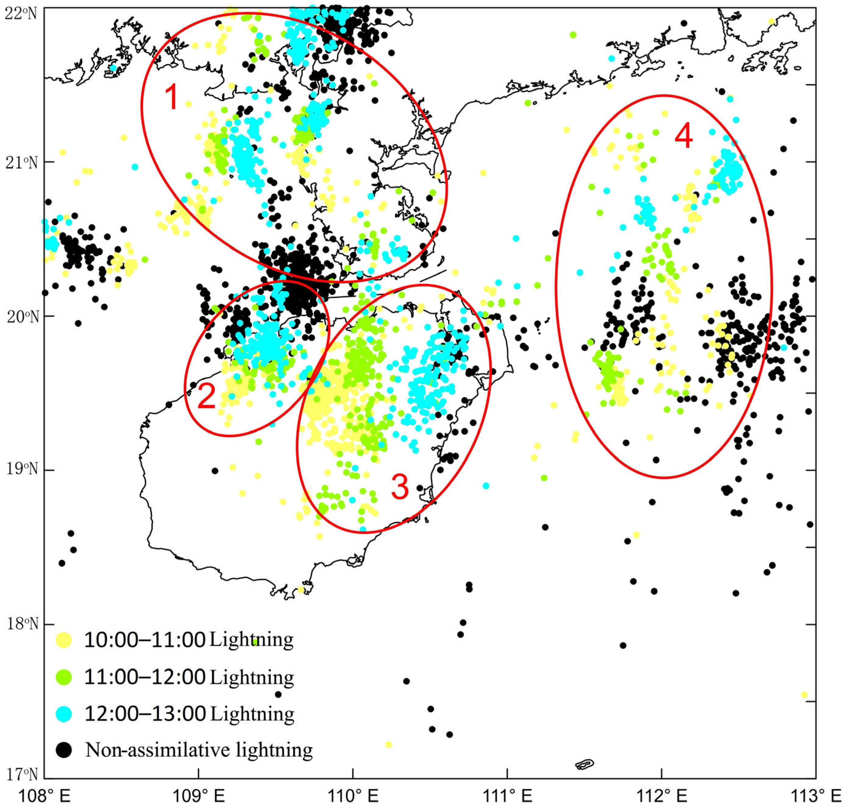- Wang, J.; Cheng, S.; Cai, L.; Fan, Y.; Zhou, M.; Li, Q.; Huang, Y. Mapping Thunderstorm Electrical Structure in the Troposphere in Warm Season with VLF/LF Total Lightning Monitoring Data over the Pearl River Delta Region, China. Atmosphere 2022, 13, 1015. [Google Scholar] [CrossRef]