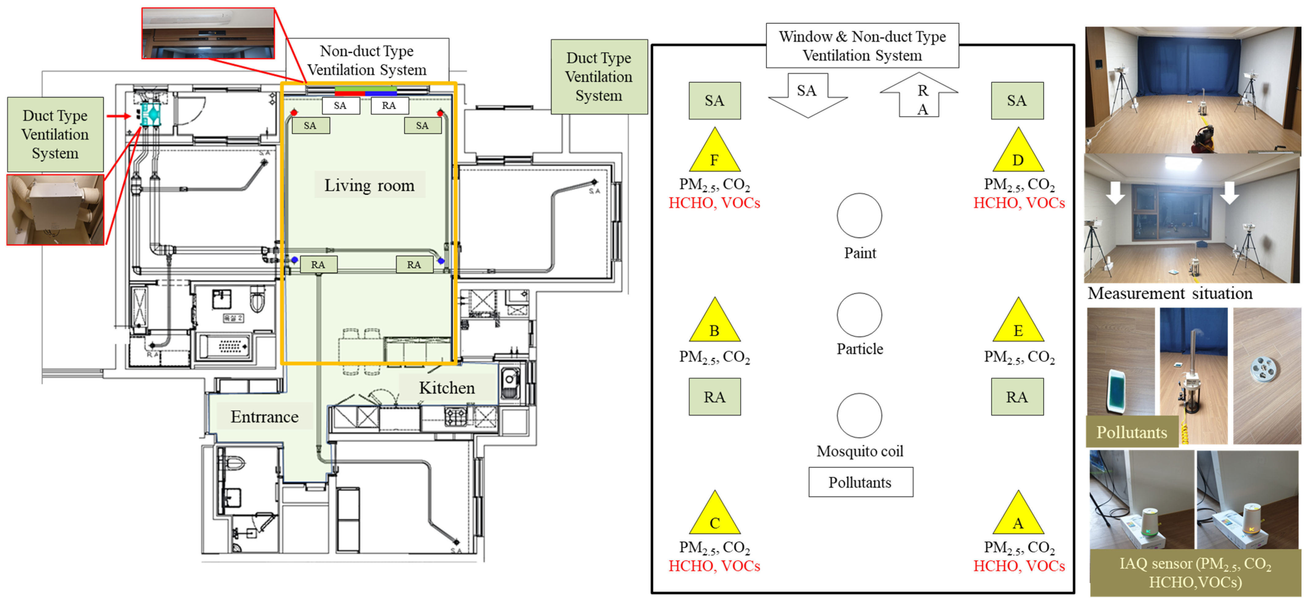 To address these limitations, the present study proposes and demonstrates a multi-pollutant, monitoring-based framework for evaluating practical residential ventilation performance under controlled field conditions. We simultaneously generate and monitor key pollutant categories representing major residential IAQ concerns—PM2.5, CO2, HCHO, and aromatic VOCs—then analyze pollutant diffusion and subsequent concentration reduction under multiple ventilation configurations in an occupied-scale apartment setting. The experimental design compares (i) a ducted ventilation configuration and (ii) a window decentralized configuration, and further evaluates an obstruction scenario to reflect realistic airflow pathway disturbances. By directly comparing pollutant-specific decay profiles and time-resolved removal behavior across configurations, the study provides evidence on how ventilation system type and airflow pathway integrity influence pollutant removal—not only for a surrogate tracer but across chemically and physically distinct pollutants.
