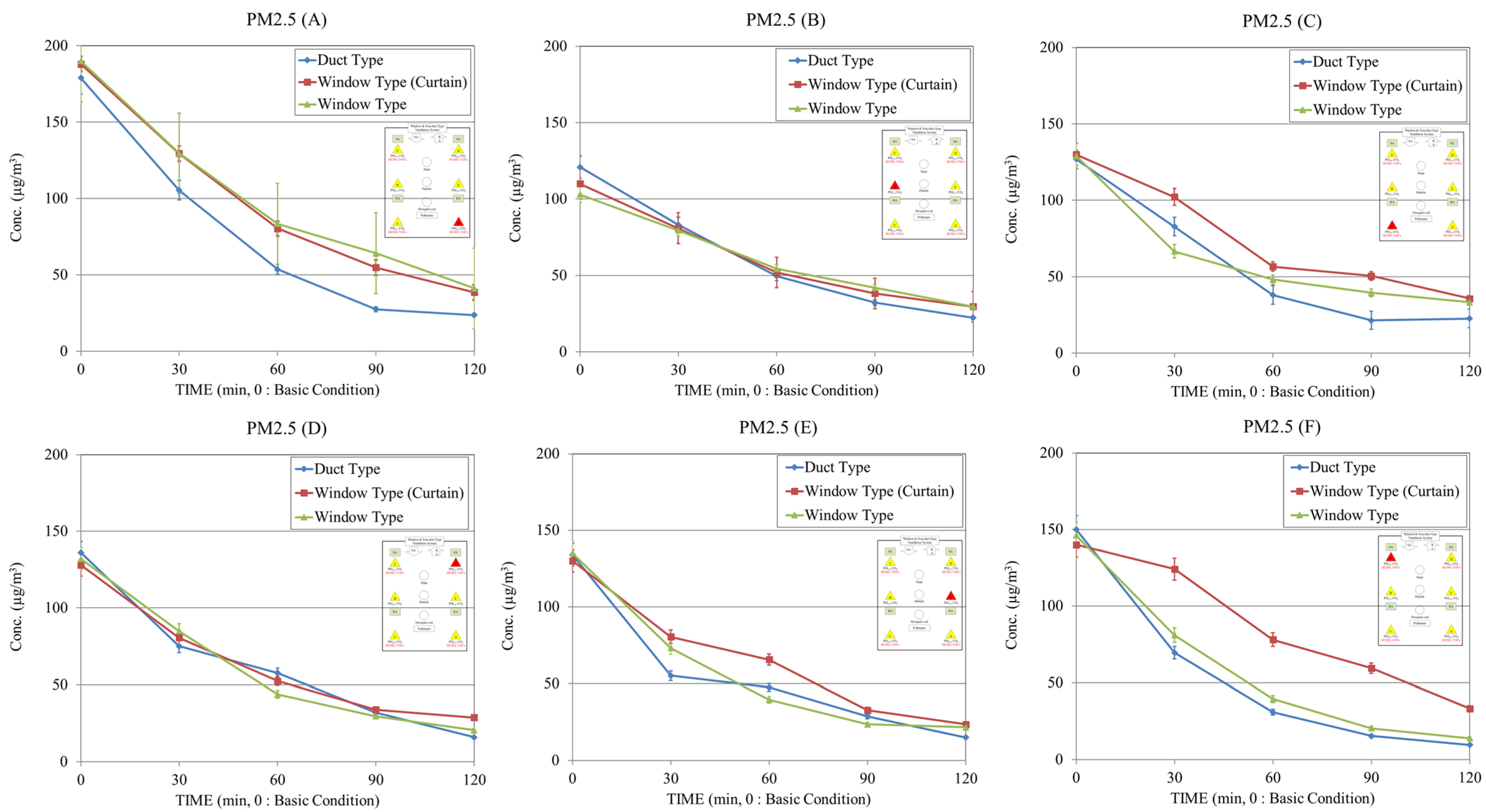2.5 concentration consistently decreased in all ventilation modes over the 120 min operation period. The duct-type ventilation system generally exhibited the fastest removal rate. The concentration changes according to the ventilation method are visually detailed in