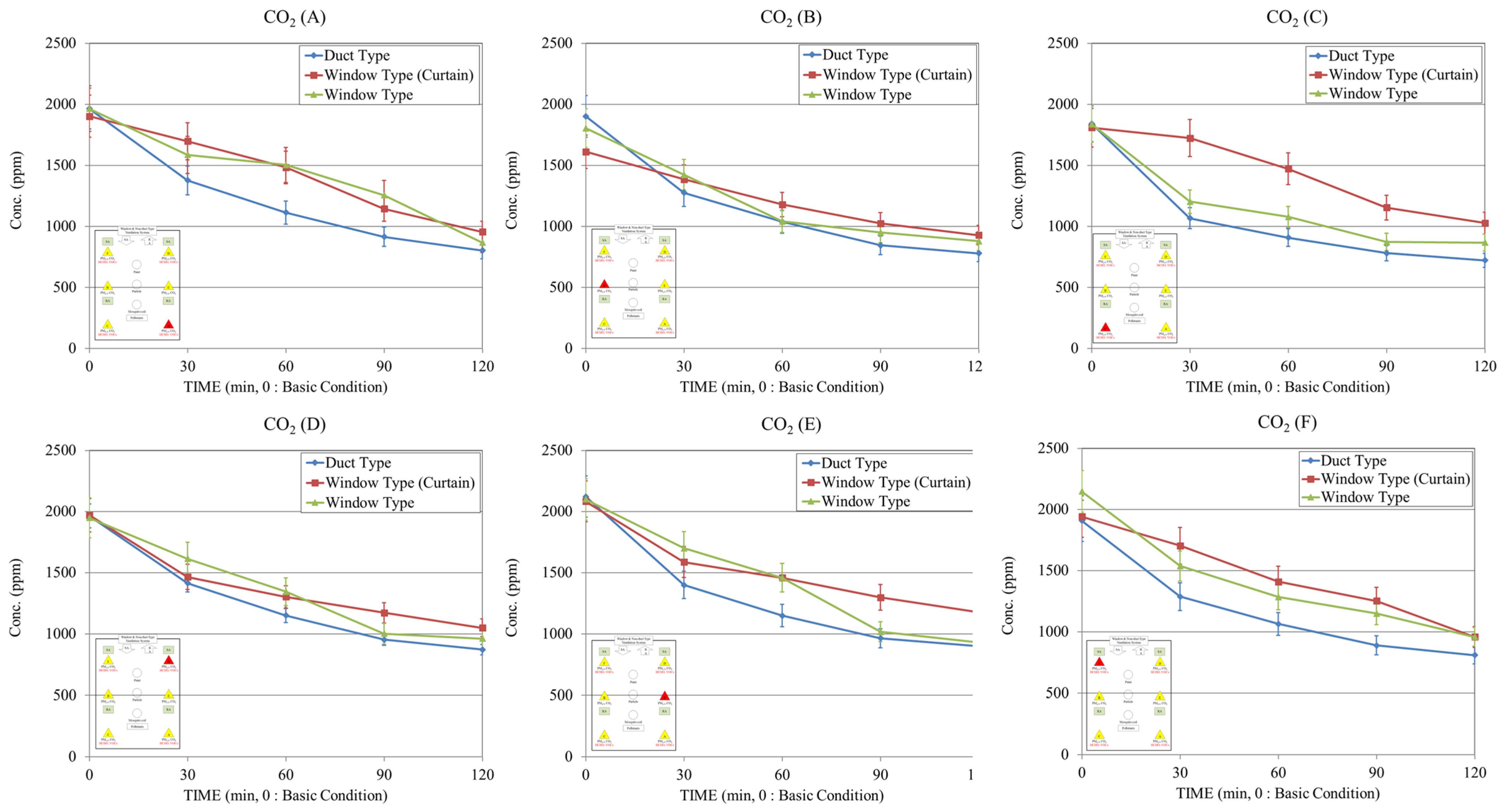 In practice, was obtained by linear regression of versus time using CO2 data recorded at 0, 30, 60, 90, and 120 min during ventilation operation. The background concentration was determined as 1 min outdoor average measured near the unit. ACRs are presented as the mean ± standard deviation across the six repeats and the six spatial locations.