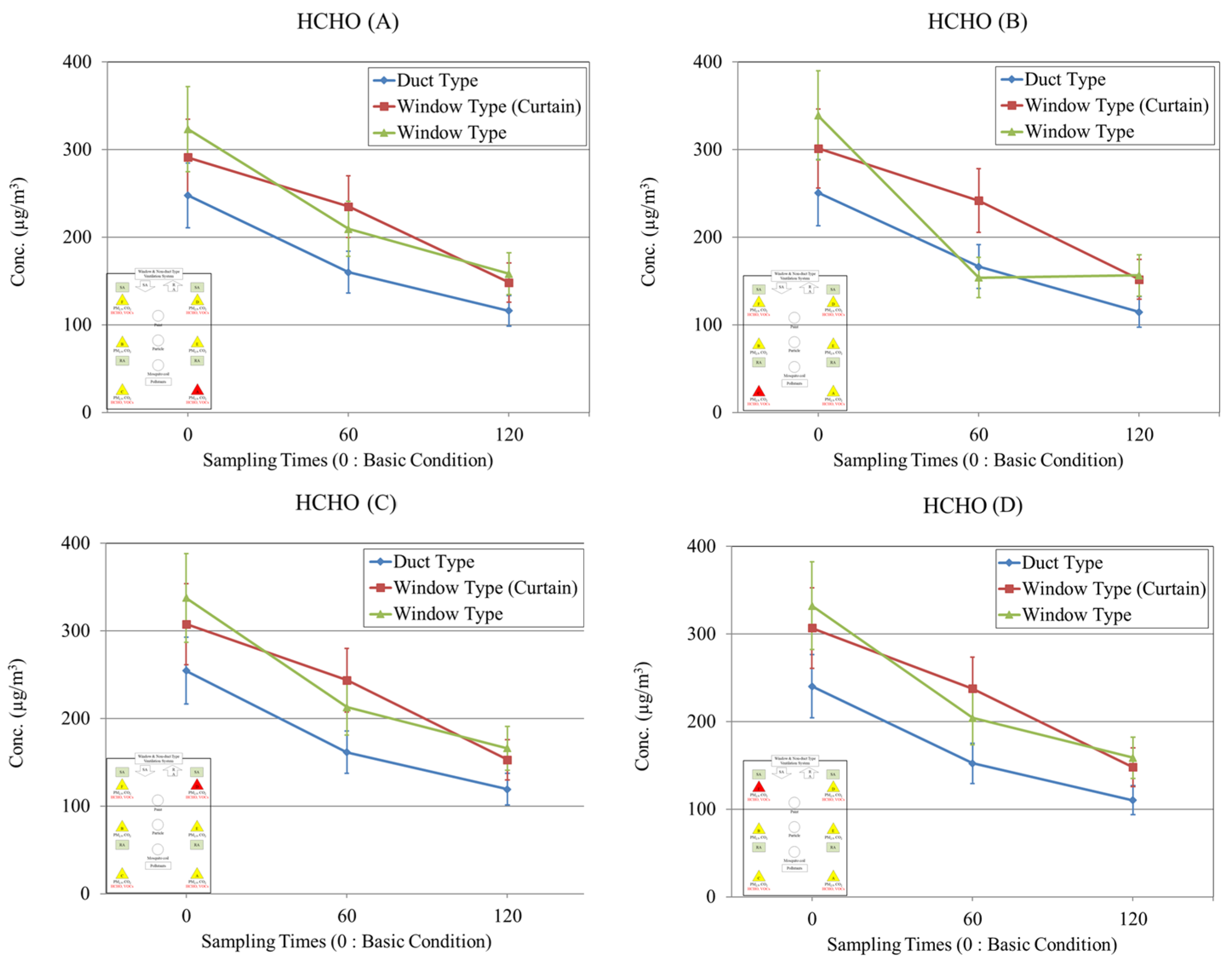 HCHO concentrations consistently decreased in all tested ventilation cases across the 2 h ventilation period. The concentration changes according to the ventilation method are visually detailed in
