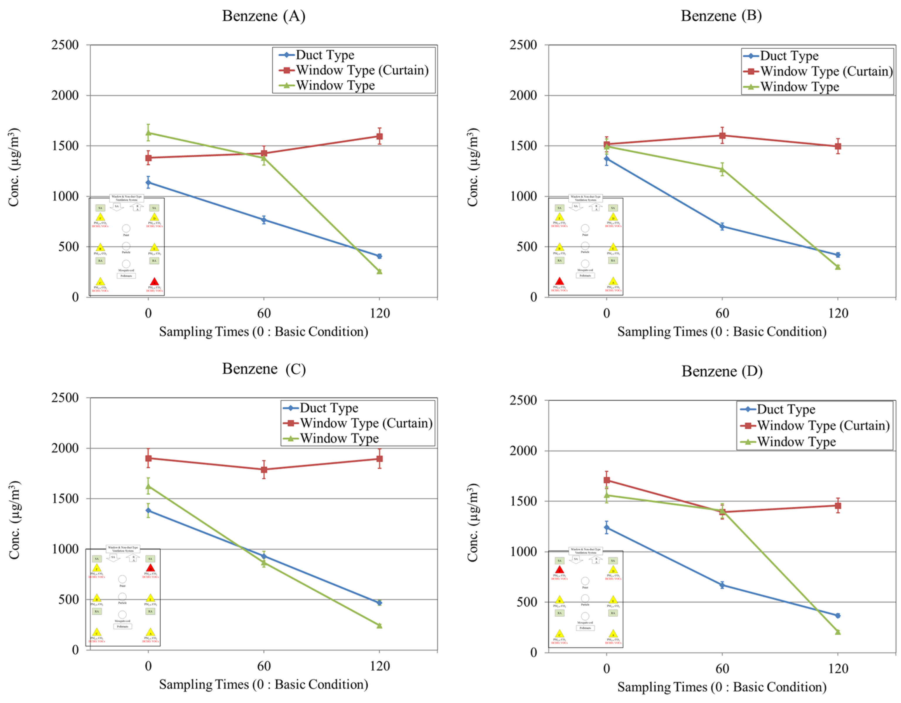 2, primarily reflecting their distinct volatility and surface interactions. Benzene generally responded strongly to ventilation, particularly under ducted operation. For example, the ducted ventilation system showed a consistent reduction from 1139.5, 767.8 to 408 μg/m