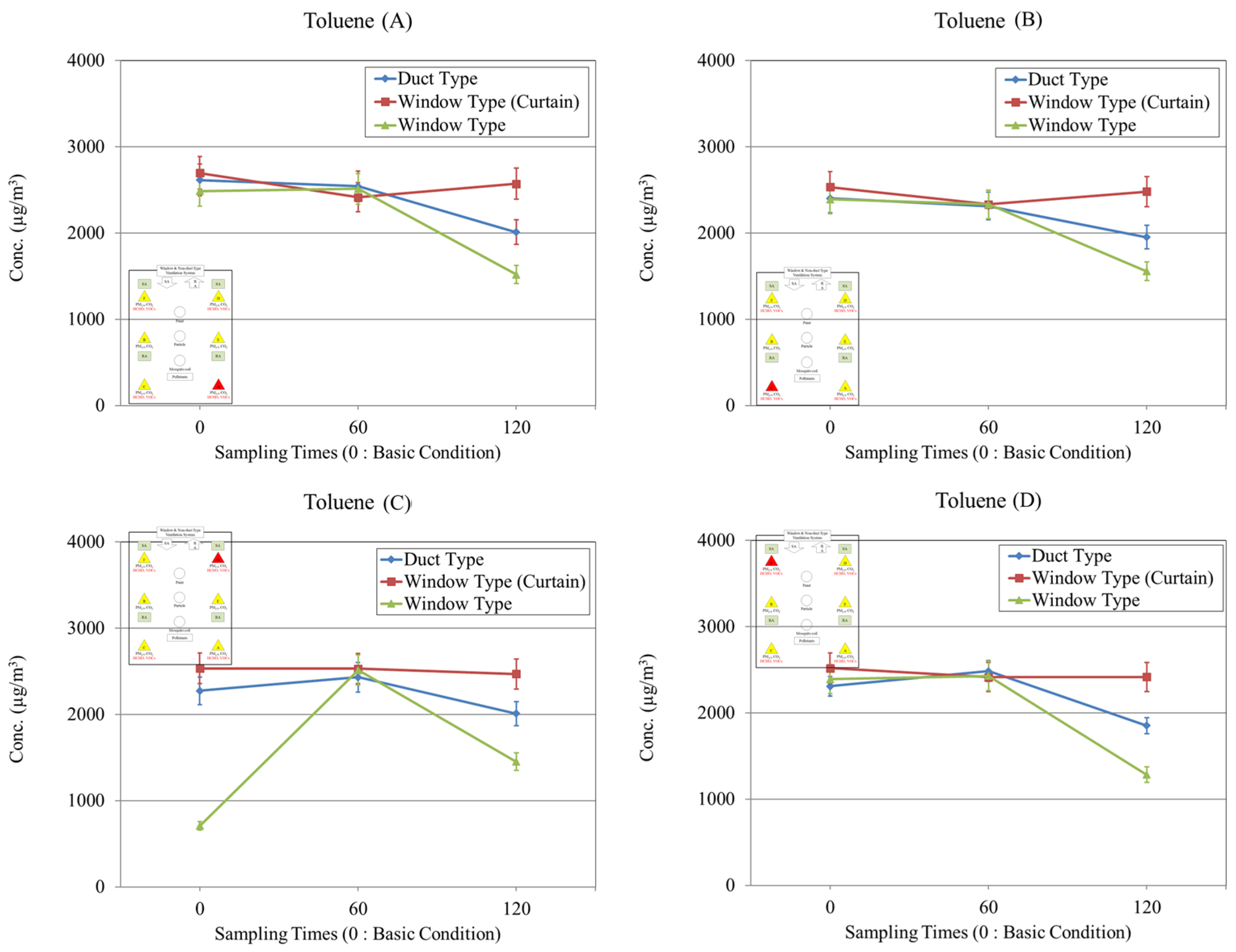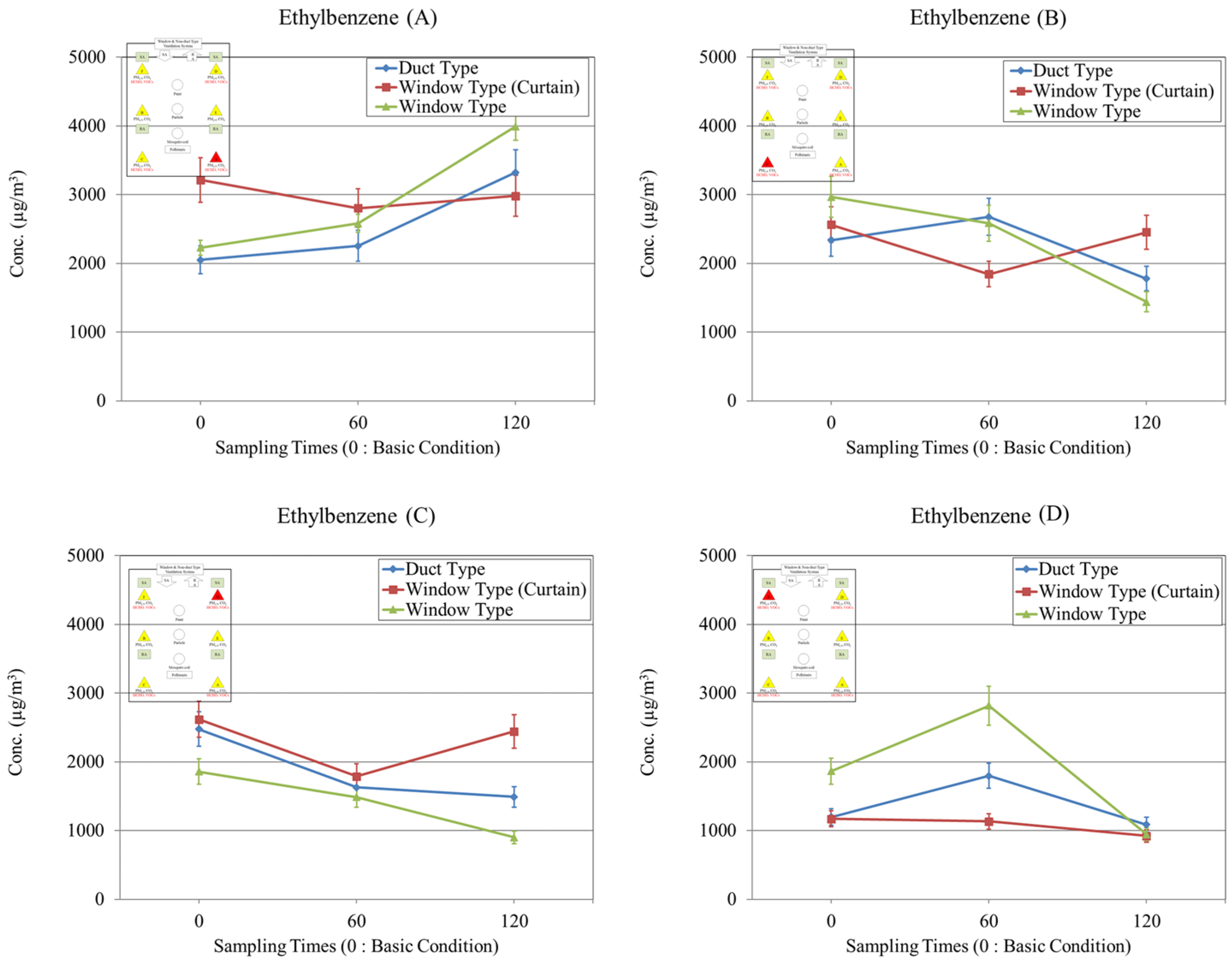 Ethylbenzene exhibited species- and case-dependent behavior; although ducted ventilation reduced concentrations in some cases, temporary increases were also observed (e.g., Location A, ducted: 2052.9 → 2254.1 → 3324.8 μg/m