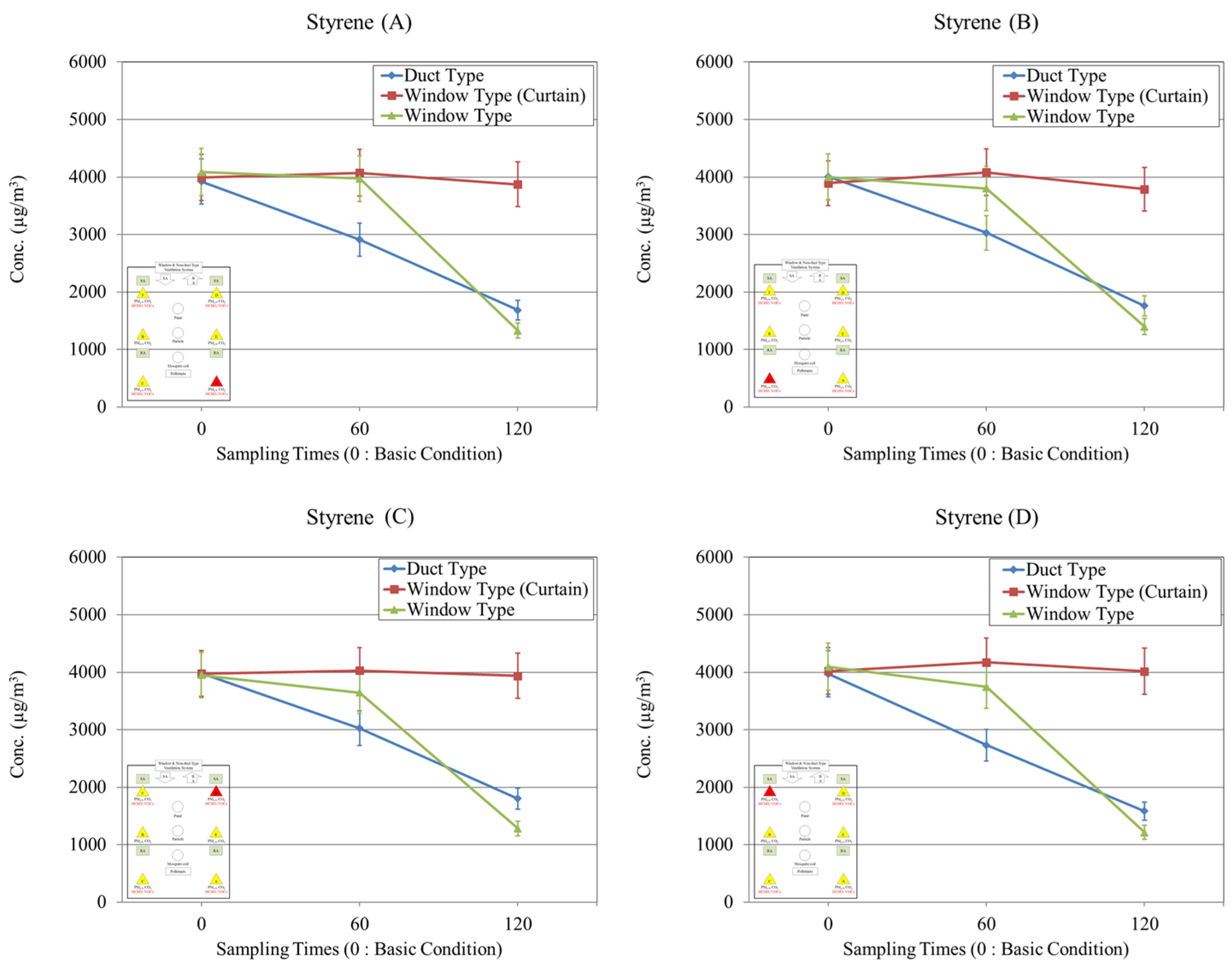 Figure 8 presents the concentration changes for styrene. These findings demonstrate that multi-pollutant monitoring is essential as it reveals removal characteristics that depend significantly on inherent pollutant properties. Therefore, ventilation performance assessment should explicitly account for these pollutant-specific dynamics rather than relying solely on single-tracer dilution assumptions.