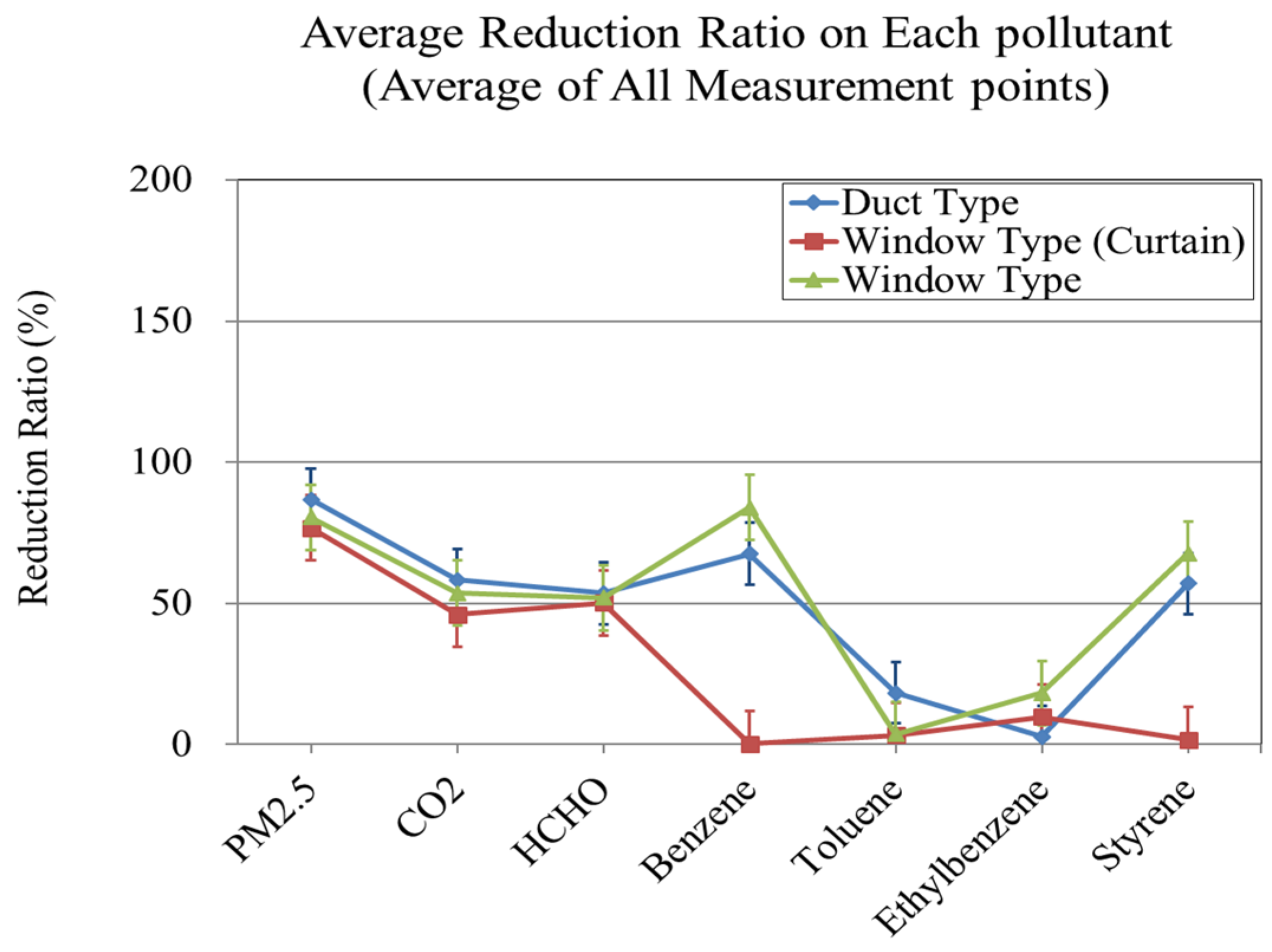 3.5. Average Reduction Rate by Pollutant According to the Ventilation Method