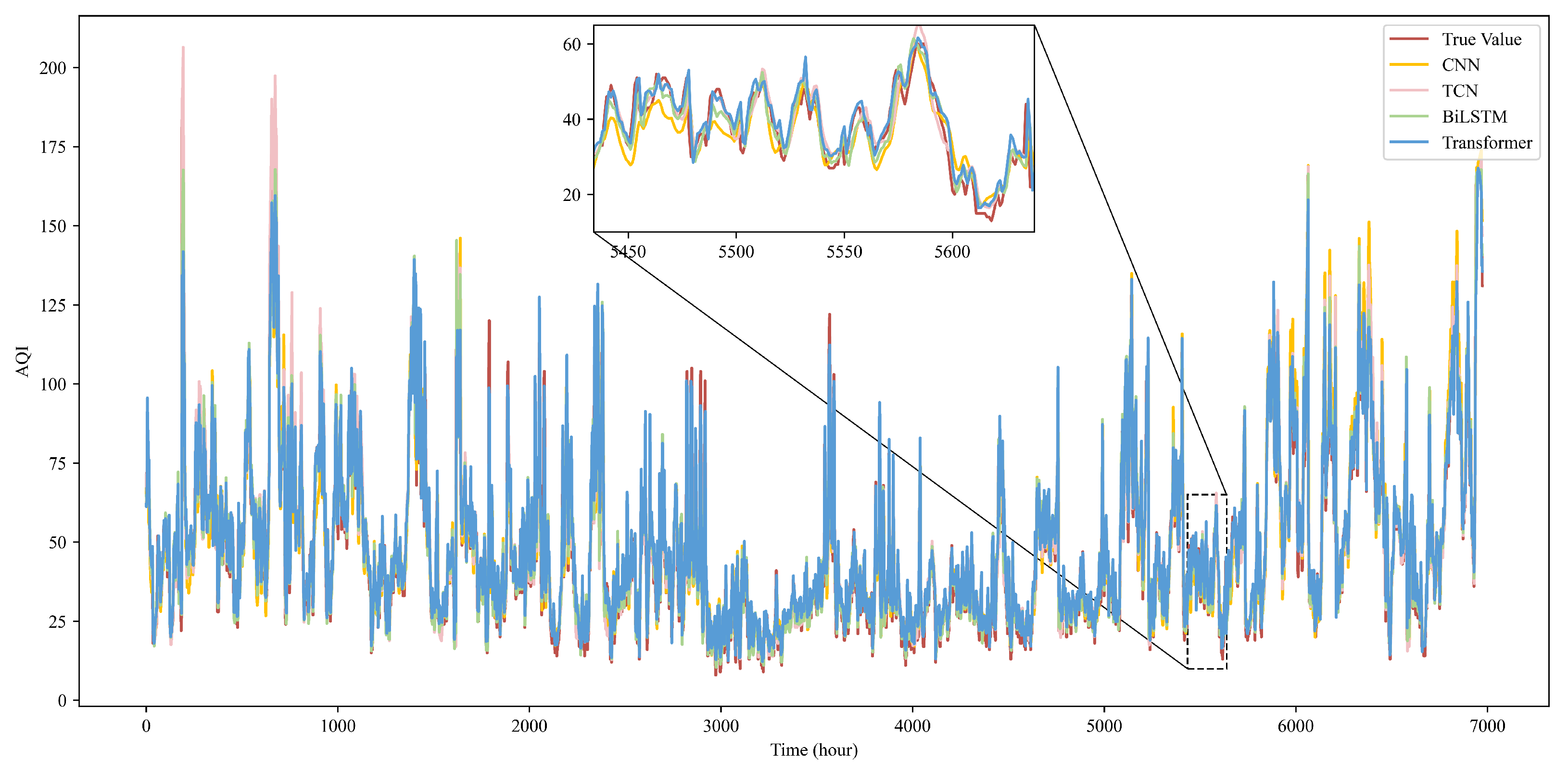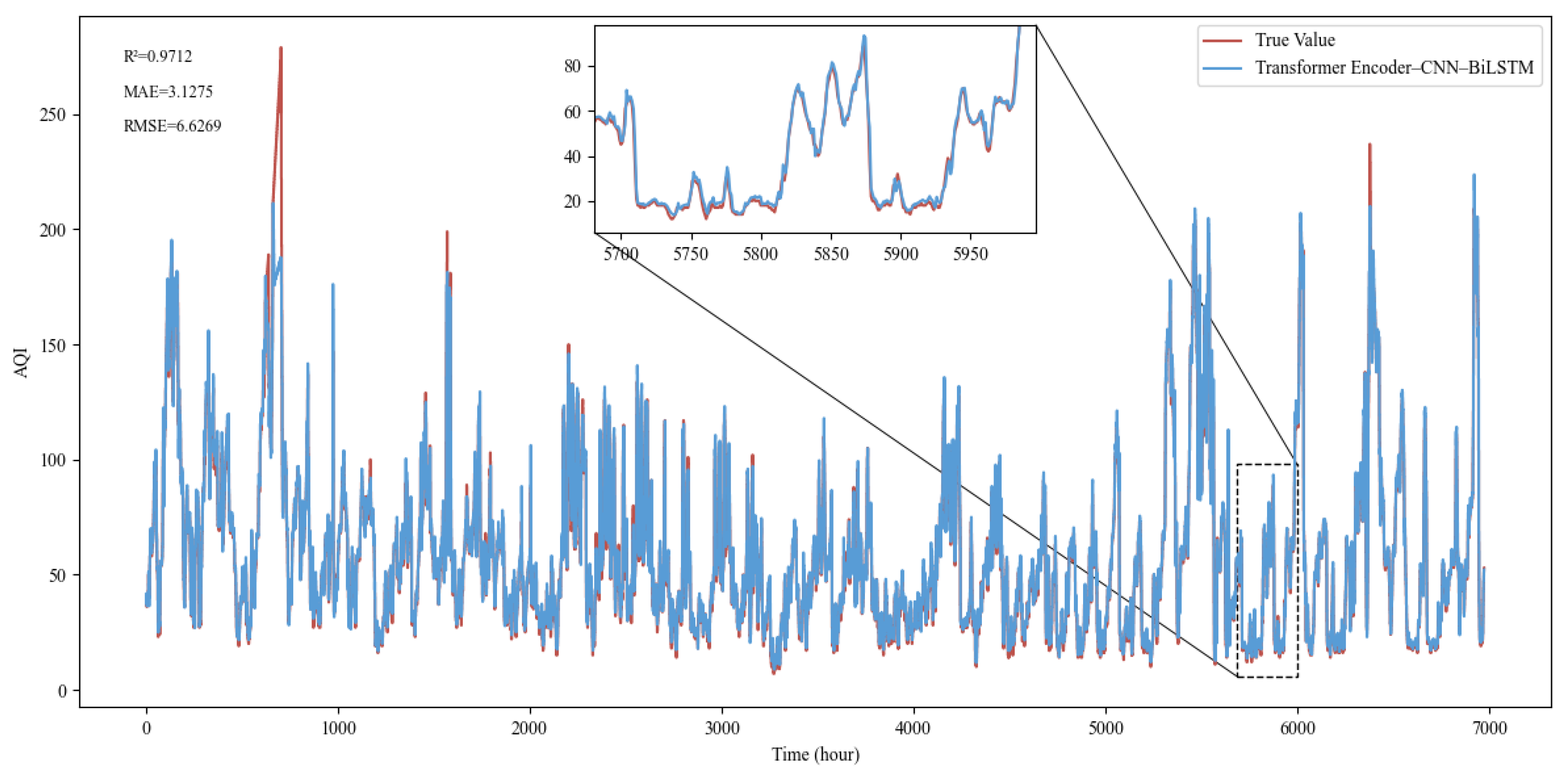 Chicago/Turabian StyleSun, Zhuoran, Qing Zhang, and Guici Chen. 2026. "Air Quality Index Prediction Based on Transformer Encoder–CNN–BiLSTM Model" Atmosphere 17, no. 3: 249. https://doi.org/10.3390/atmos17030249