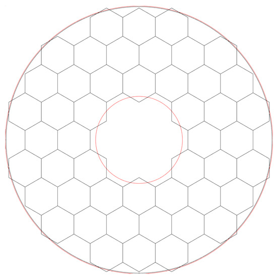 The microlens arrangement of the SH-WFS. The outer large red circle represents the pupil of the telescope, while the inner small circle is the obscuration of the pupil by the secondary mirror.