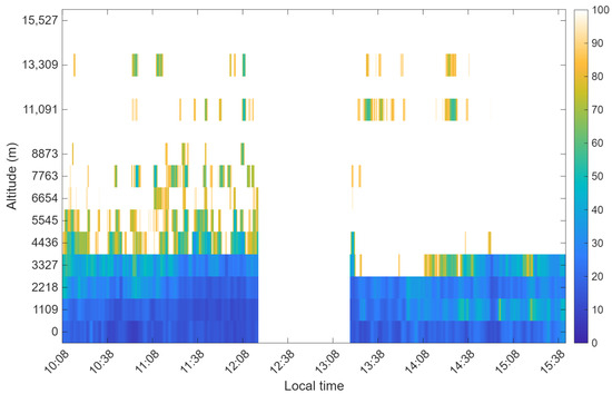 Figure 12 reveals similar turbulence intensity distributions during morning (10:00–11:00) and afternoon (14:00–16:00) periods, while the interval between 11:00 and 14:00 exhibits a characteristic pattern of concentration toward the surface layer followed by gradual dispersion, with ground-layer (0 km) turbulence contribution reaching maximum values of 62.6%. Above 4 km altitude, only weak turbulence is consistently observed.