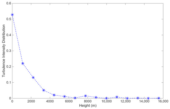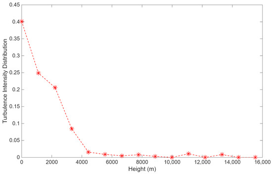 Statistical analysis of daily data yields the atmospheric turbulence intensity distribution for 28 November 2023, presented in Figure 9. The turbulence intensity is aggregated over the entire day. Specifically, for each altitude layer, the atmospheric coherence length is first converted into the refractive index structure constant , as is an additive and averageable quantity. By averaging across different layers, the average turbulence intensity at various altitudes is obtained. Figure 9 displays the relative proportions of turbulence intensity between different layers, calculated by dividing the value at each layer by the sum of across all layers. Results indicate that approximately 40% of turbulence occurred at the ground layer (modeled as a discrete layer near 0 km altitude), with 94% of total turbulence intensity concentrated below 4 km altitude. Only sporadic weak turbulence was observed above 4 km.