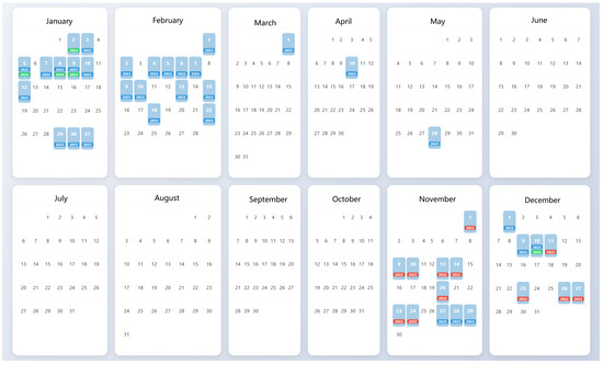 The distribution of valid observation dates. The light blue highlighted dates in the figure indicate the days on which valid data were collected. The red, blue, and green bars within the light blue boxes represent the years 2022, 2023, and 2024, respectively.