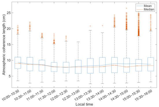 Distinct diurnal variation is evident in the values. The temporal evolution and corresponding statistics, which are derived from all valid observation days, are presented in Figure 11 and Table 1. Note that for short-term, real-time monitoring data such as these, the occurrence of occasional outliers (both low and high values) is considered normal and is reflected in the statistical ranges provided. Optimal conditions occur during morning hours (10:00–10:30) with mean reaching 9.38 cm; around local noon (12:00–12:30), decreases to 7.75 cm due to enhanced ground-layer heating; during afternoon hours (14:00–16:00), conditions gradually recover with mean values approaching 9 cm.