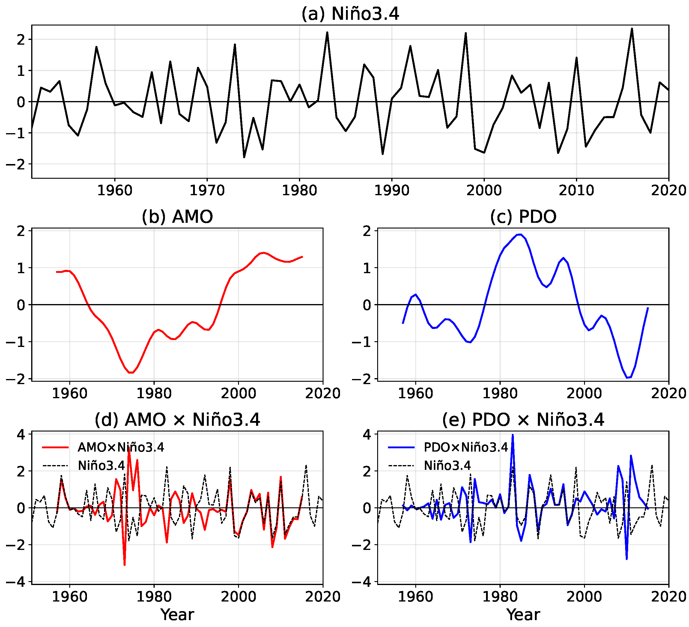 3.1. Role of the AMO–ENSO Nonlinear Interaction