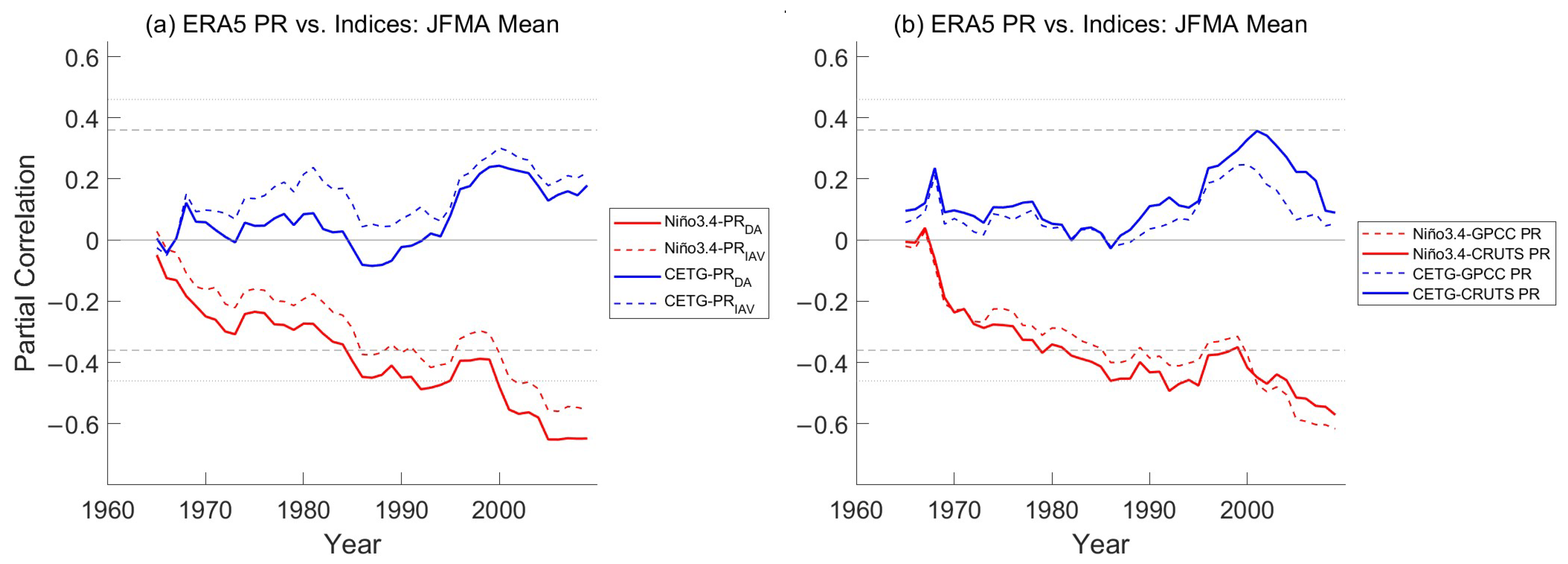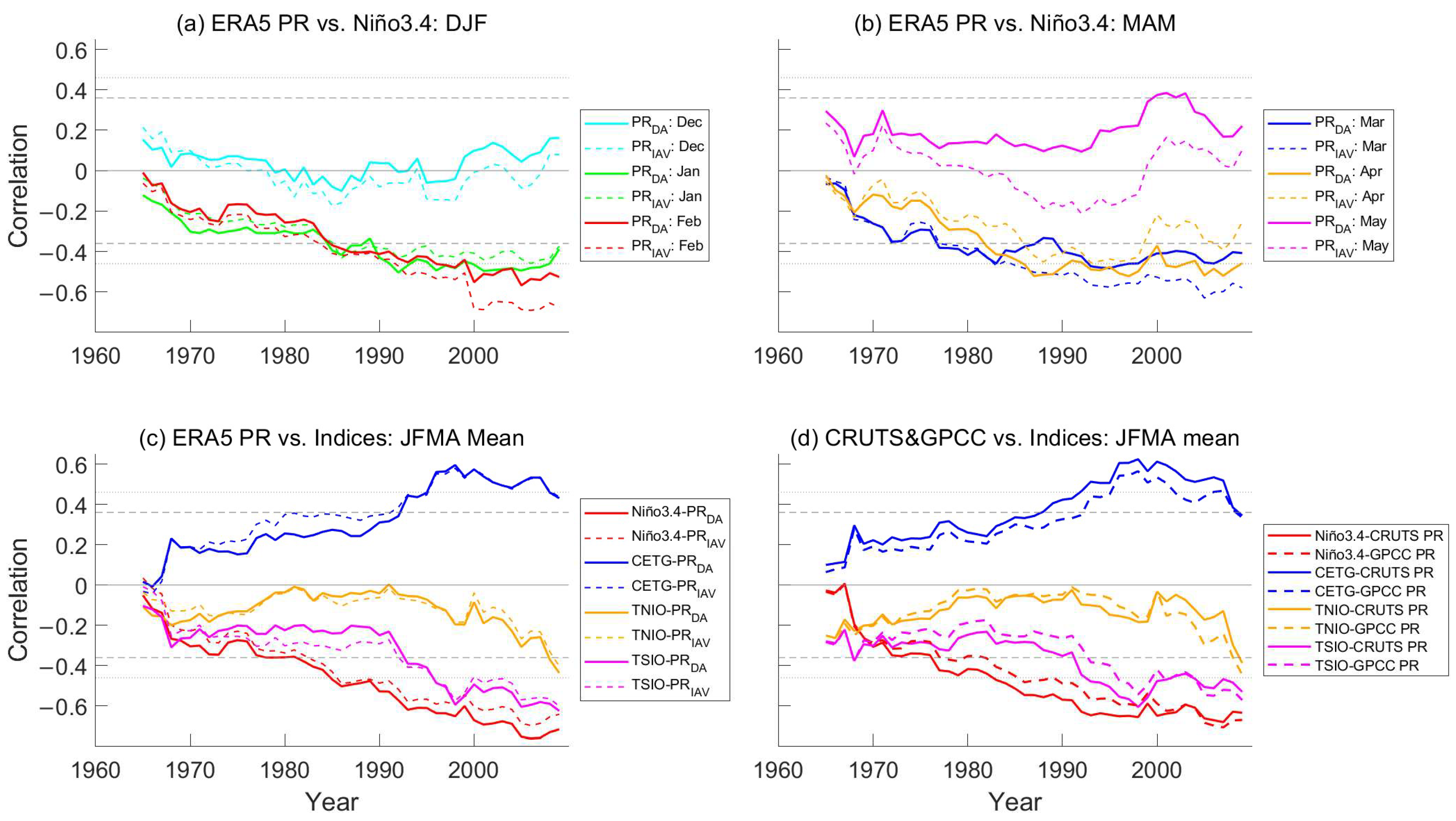 3.1. Long-Term Evolution of the ENSO–Rainfall Relationship During January–April