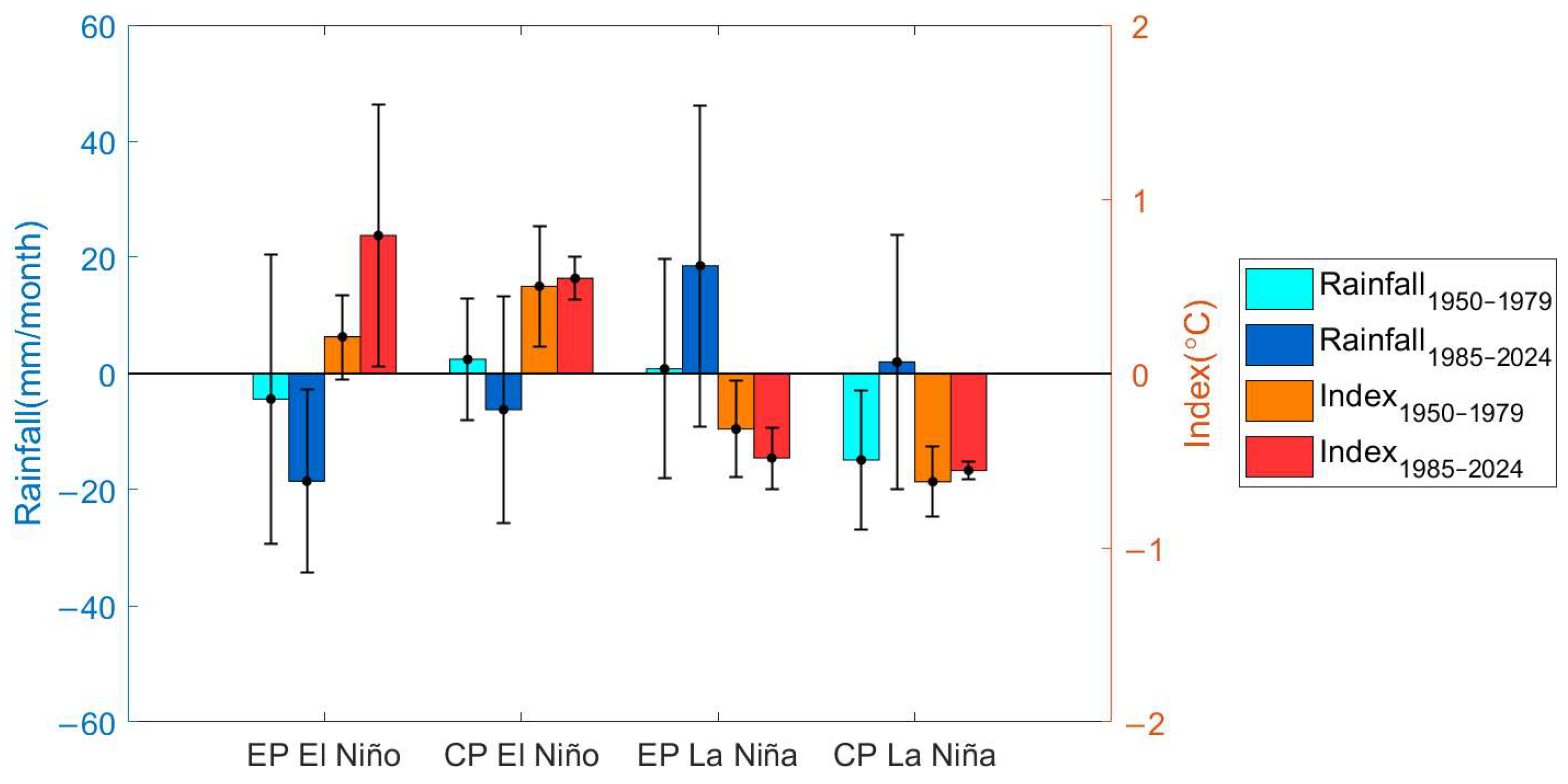 3.3. Comparison of EP and CP ENSO Influences on SISL Rainfall
