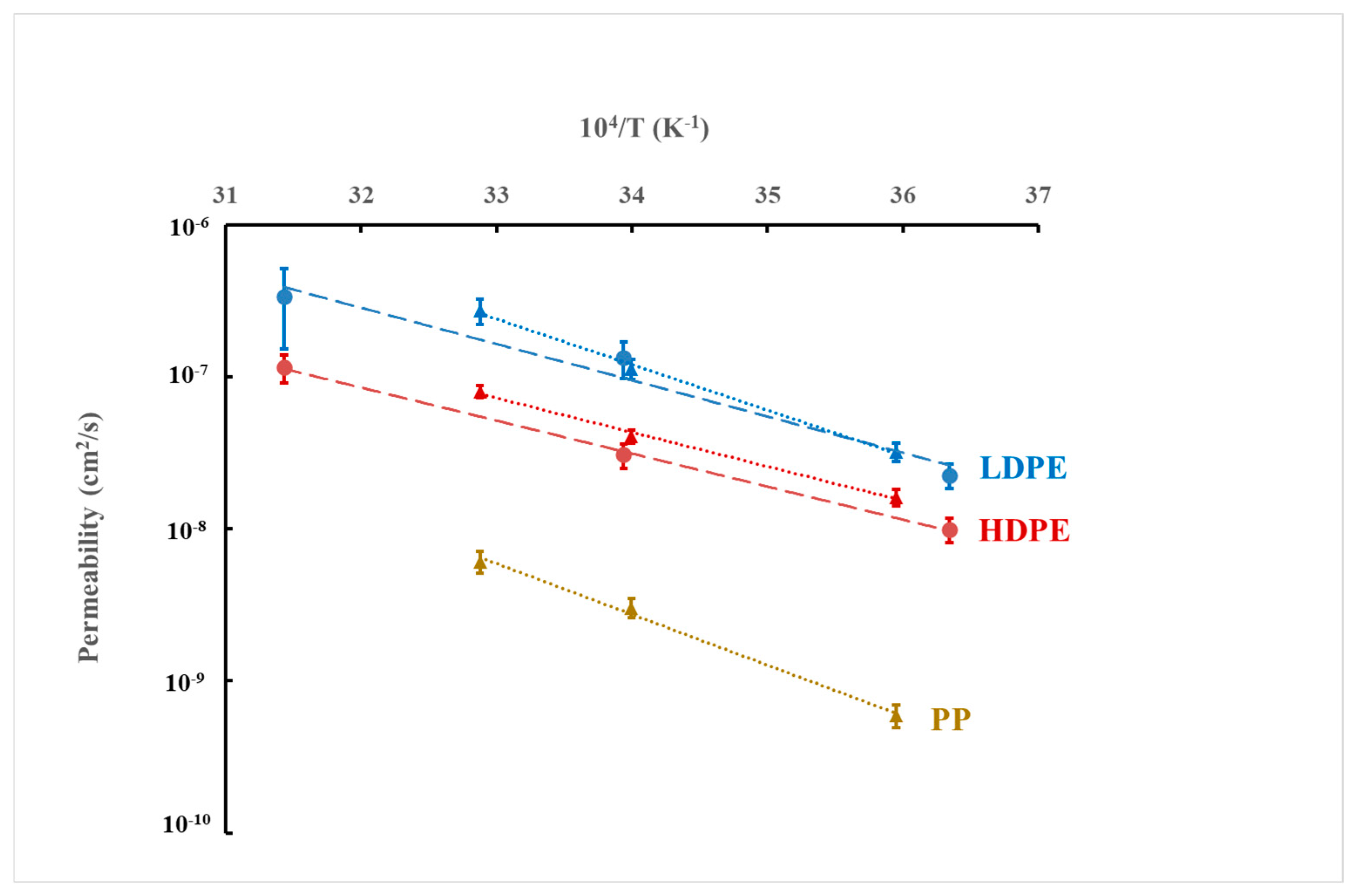 - HDPE (P0 = 3.57 × 10−8 cm2/s, EP = 42.3 kJ/mol)
