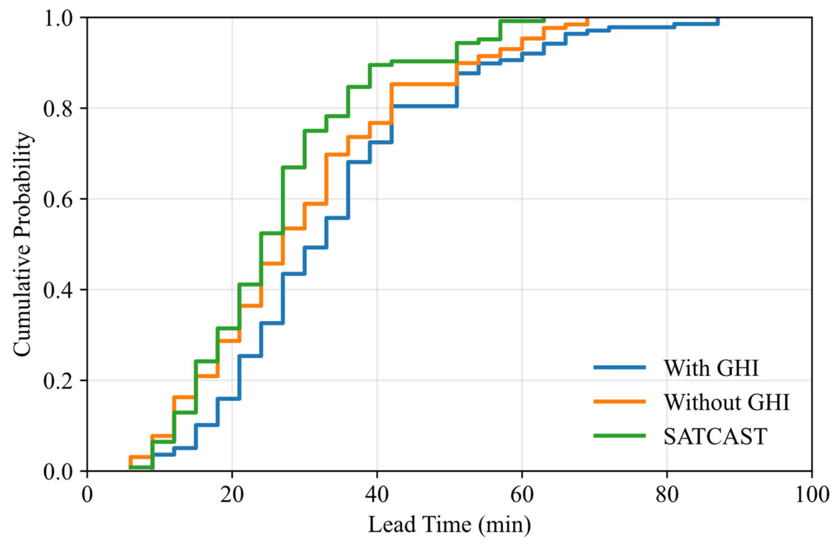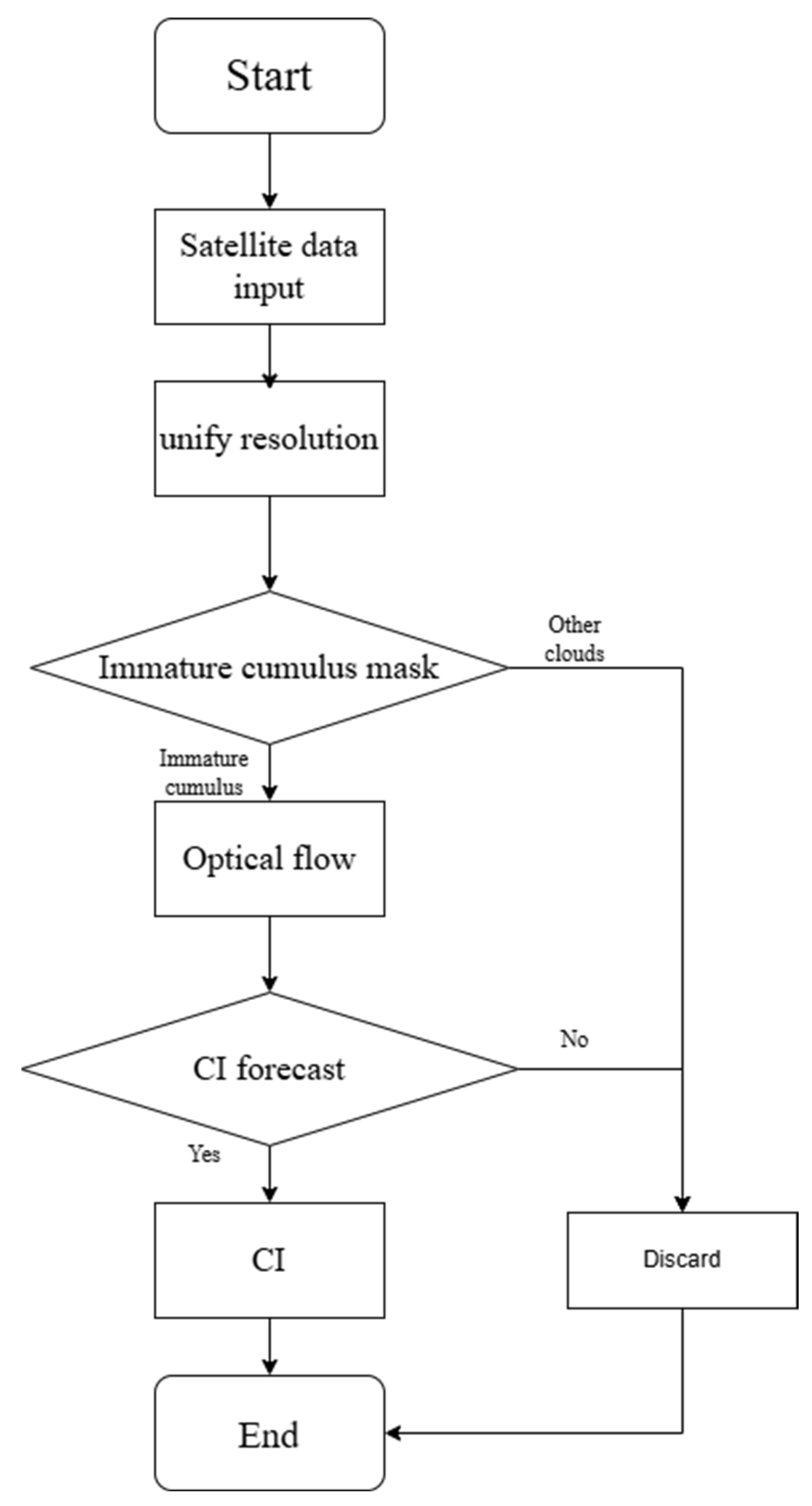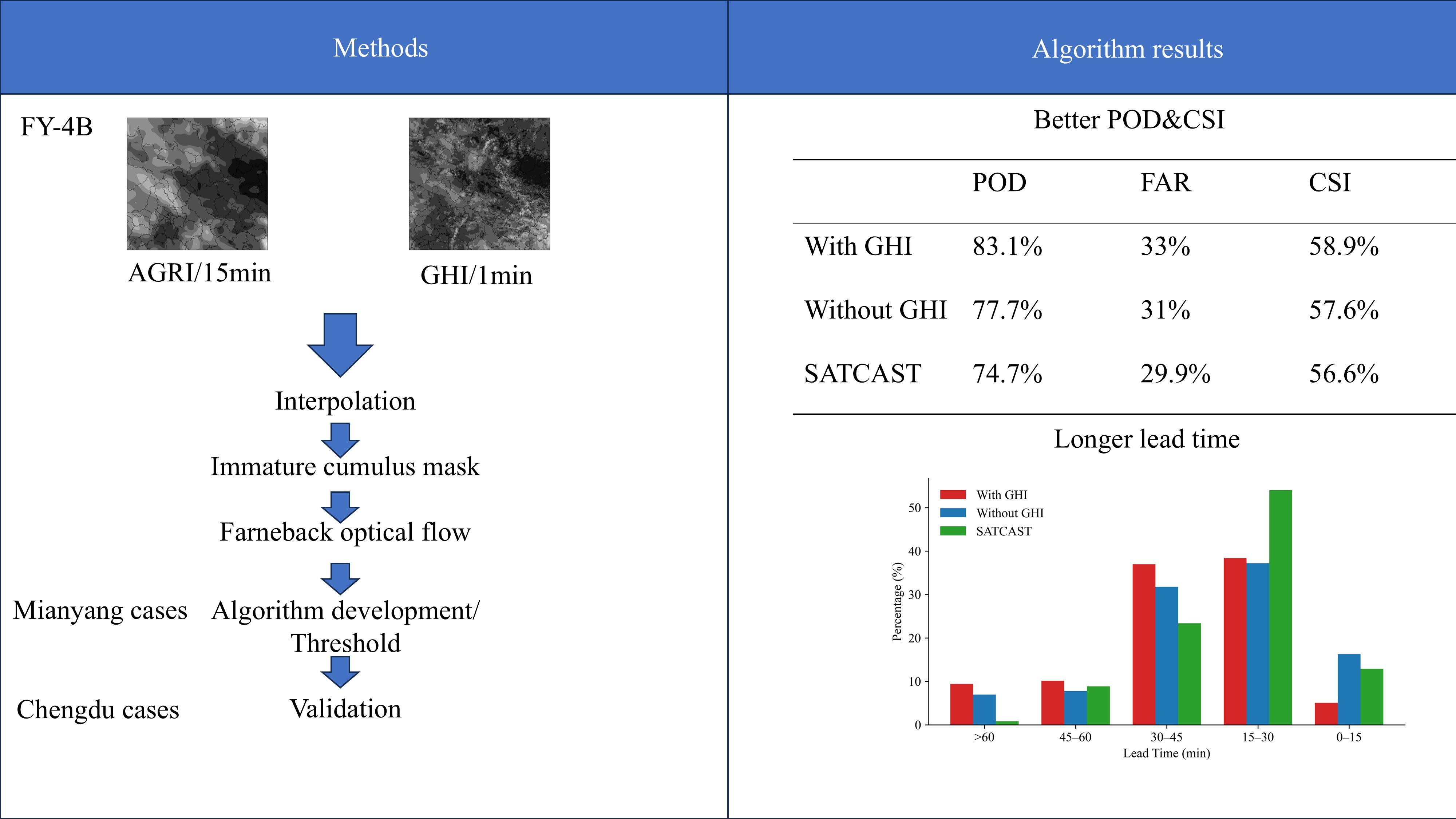 The proposed CI detection algorithm is based on physically interpretable satellite observations such as visible reflectance, brightness temperature (TBB), brightness temperature differences (BTDs), and cloud-top cooling, all of which are closely related to the microphysical and dynamical effects of convection clouds. The cumulus cloud mask is important to reduce the effects of non-convective clouds such as thin clouds. By combining reflectance thresholds and texture properties, the mask removes actively developing cumulus clouds and can reduce contamination from optically thin cloud layers. Environmental factors such as water vapor inhomogeneity and condensed moisture are not directly described, but they are well estimated in the satellite observations. For instance, the brightness temperature and the variation in its timescale are sensitive to cloud-top height and cooling, which are strongly affected by atmospheric moisture and latent heat releases, and the brightness temperature between infrared channels indirectly relates the cloud optical thickness and microphysical properties. We also compare the results with those of the algorithm without GHI data and the original SATCAST algorithm.