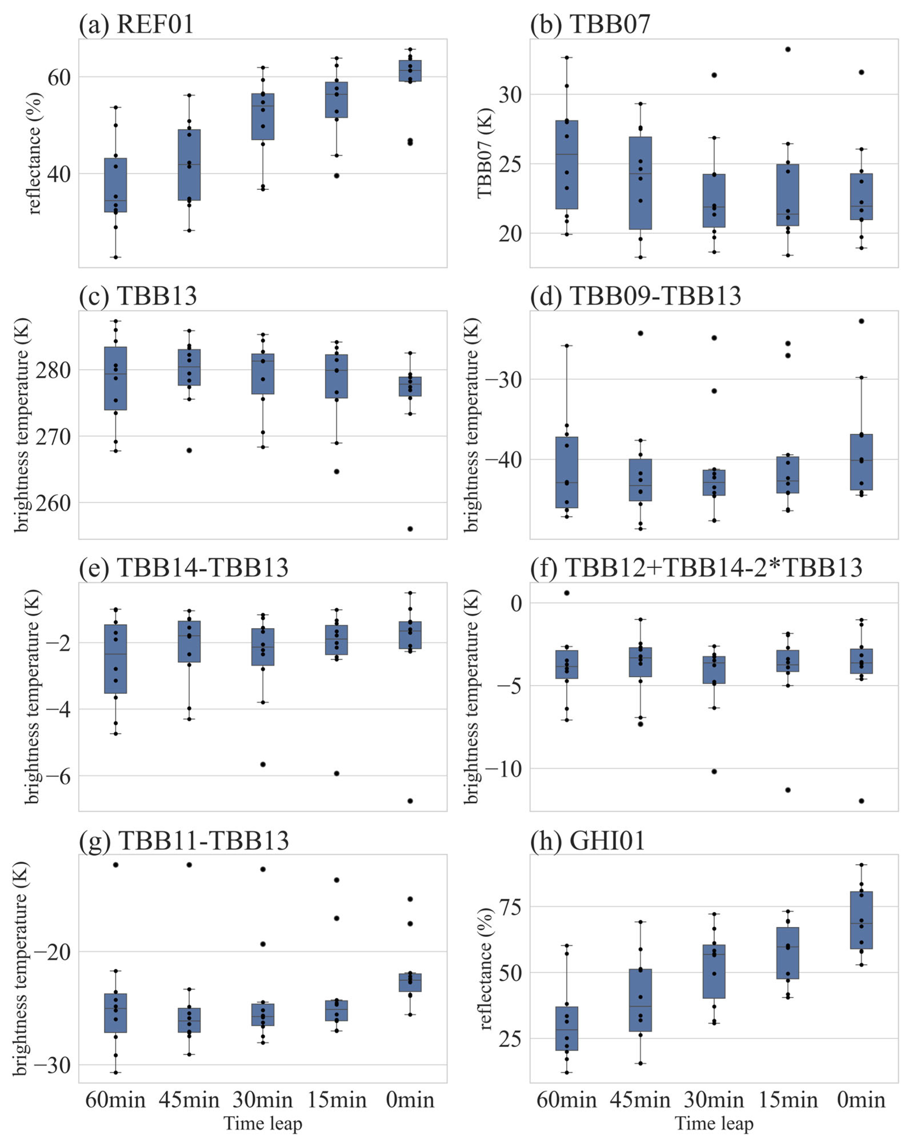 Figure 2 displays box plots of the selected criteria’s distances relative to the convective initiation event time at 60 min, 45 min, 30 min, 15 min, and 0 min prior. The 0 min mark represents the start time of the AGRI scan preceding event occurrence.