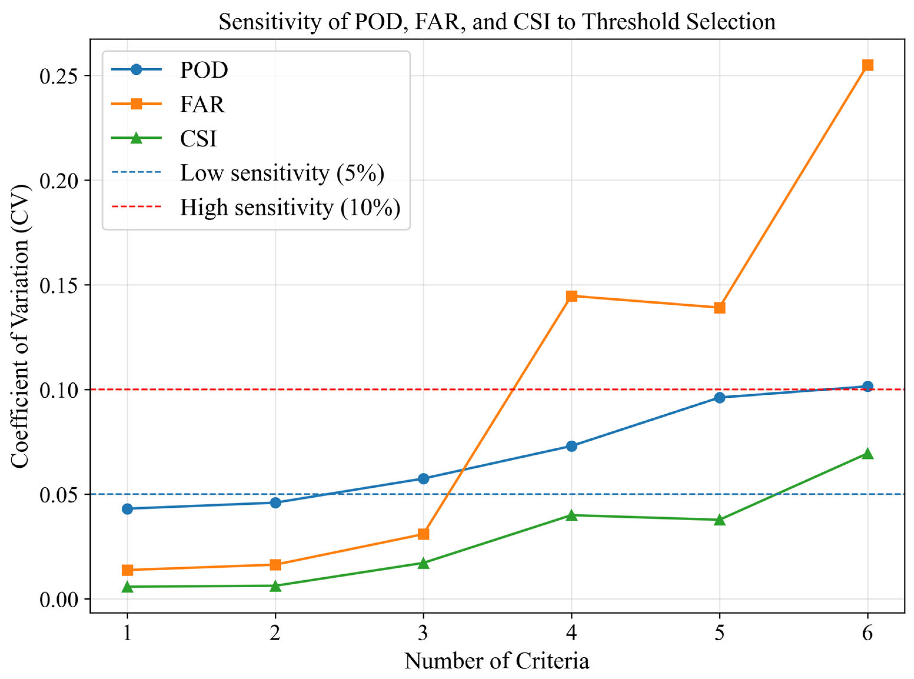 The coefficient of variation for threshold selection was employed to analyze the sensitivity of the POD, FAR, and CSI in