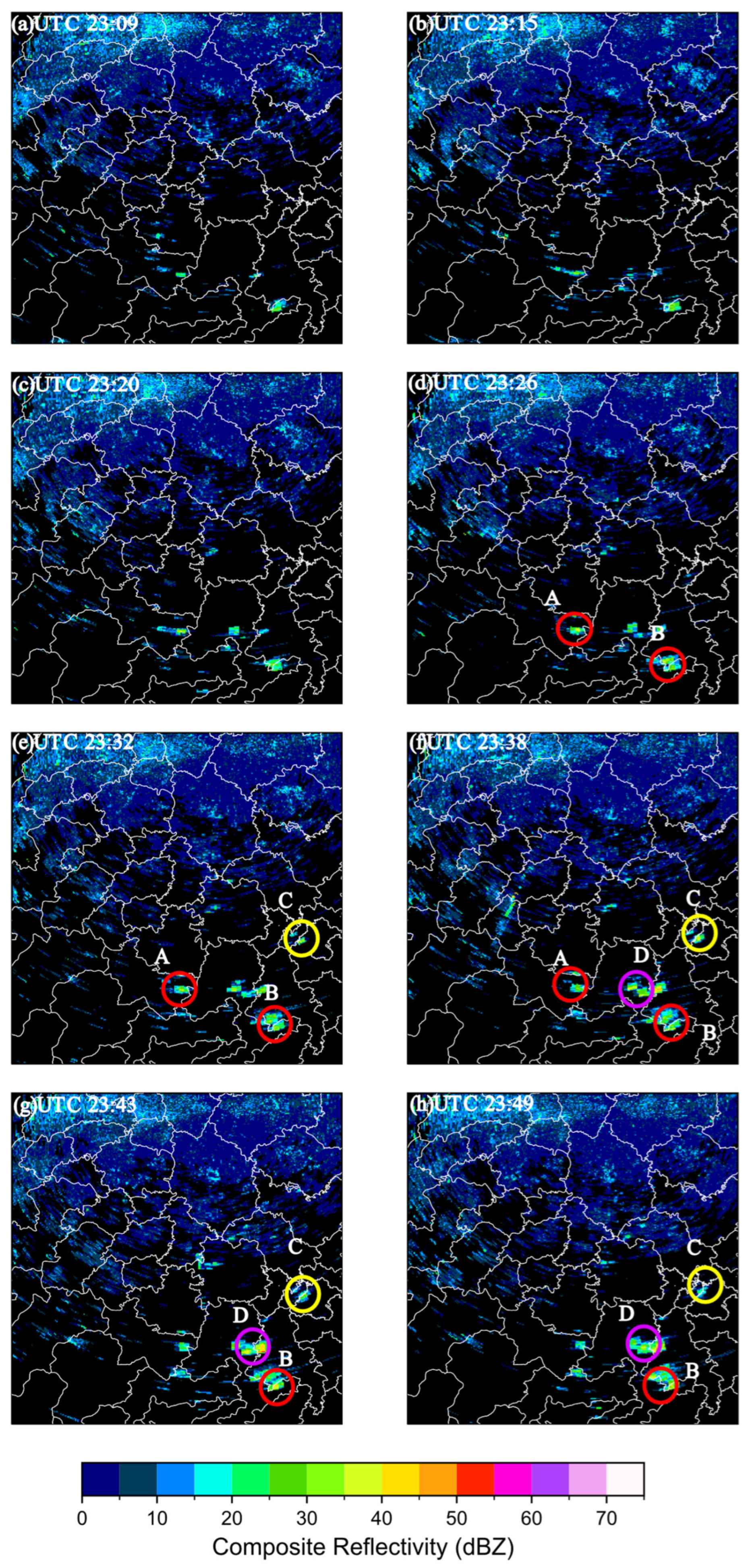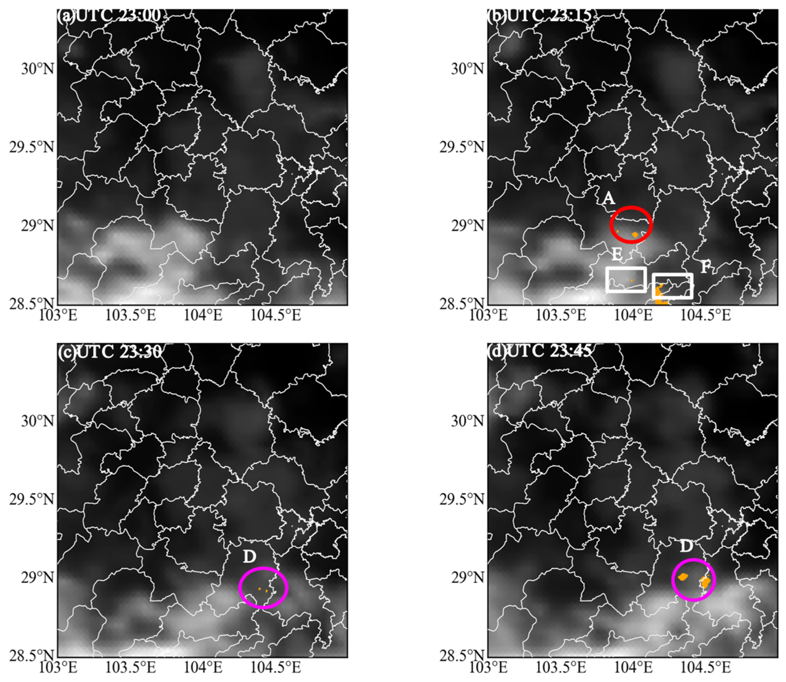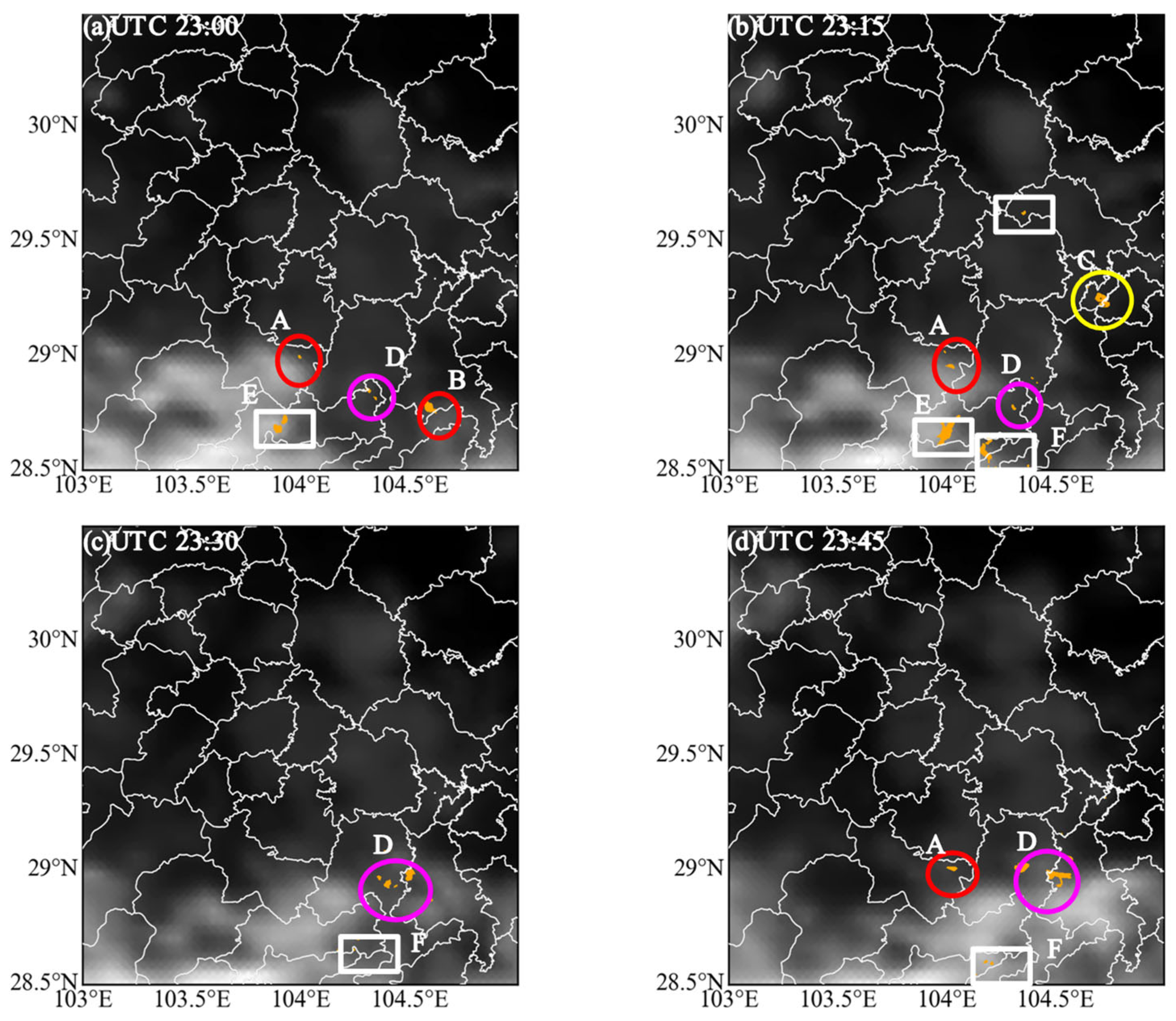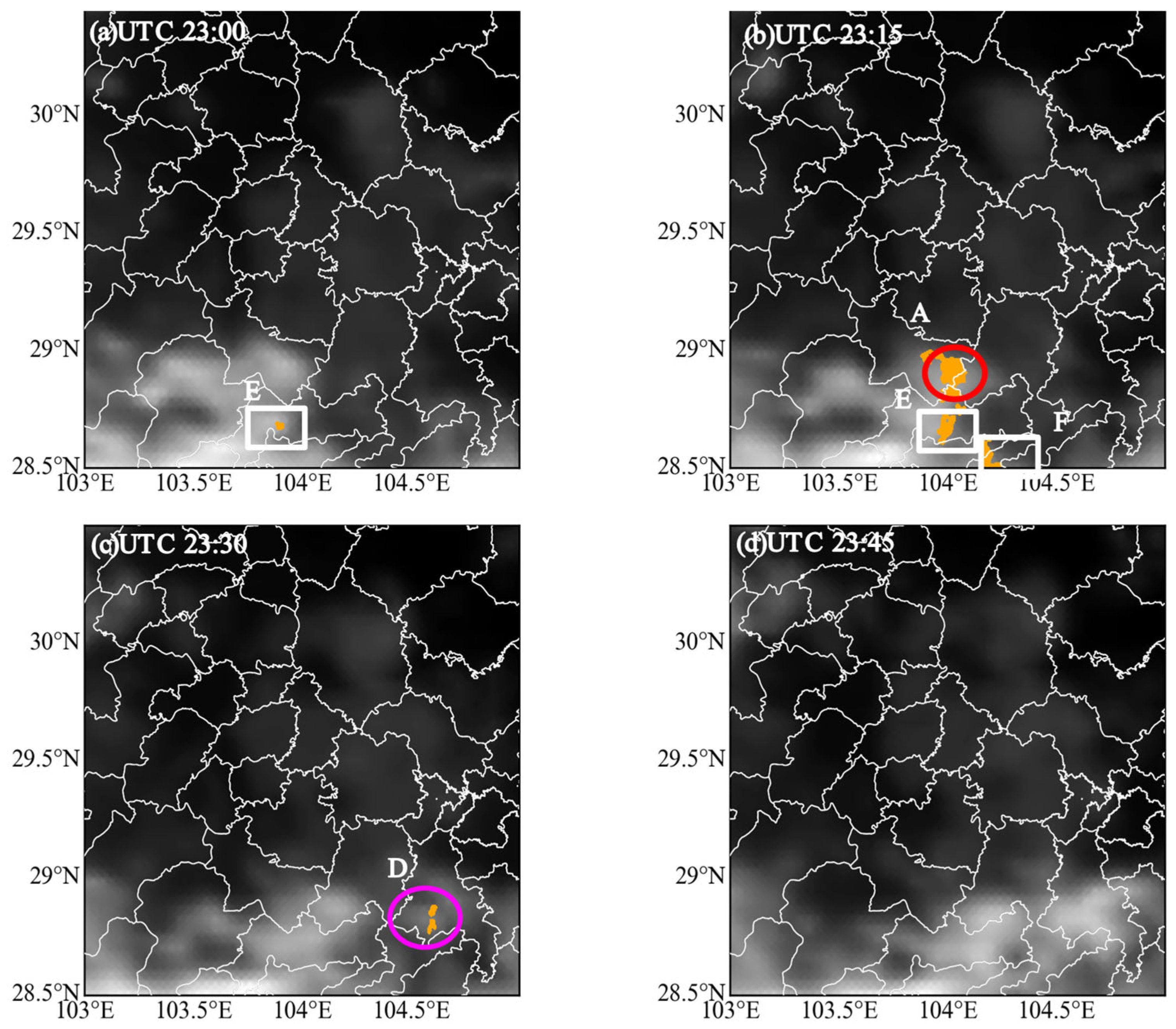 Based on the results outlined above, we are able to build upon the algorithm as follows: Delta TBBGHI < −2 K/15 min convection will have occurred in the region if four or more of the six criteria are satisfied. Typically, cumulonimbus clouds will be cloudy. It can be observed that Sichuan typically shows overcast conditions with warm-sector convection in the summer. For that reason, when radar echoes exceed 35 dBZ, TBB13 might still be high at that point in the case of low cooling. The criteria are therefore relaxed to better detect these convection cases.