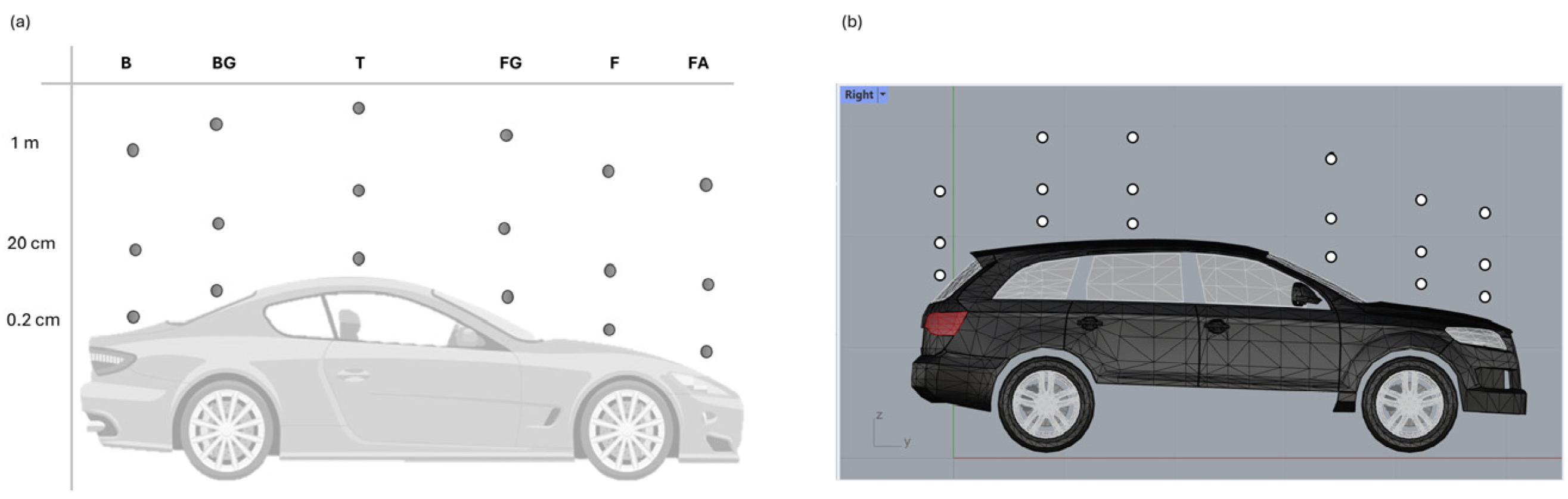 Figure 1 illustrates the measurement locations, as well as the points where simulated temperatures were extracted. Air temperatures were recorded above the roof of each vehicle at three different heights: 0.2 cm, 20 cm, and 1 m. Measurement locations are defined as follows: Top (T) refers to the central roof area; Front Glass (FG) corresponds to the upper part of the windshield; Front (F) and Front Ahead (FA) represent forward roof sections; Back (B) and Back Glass (BG) correspond to the rear roof area and rear windshield, respectively.