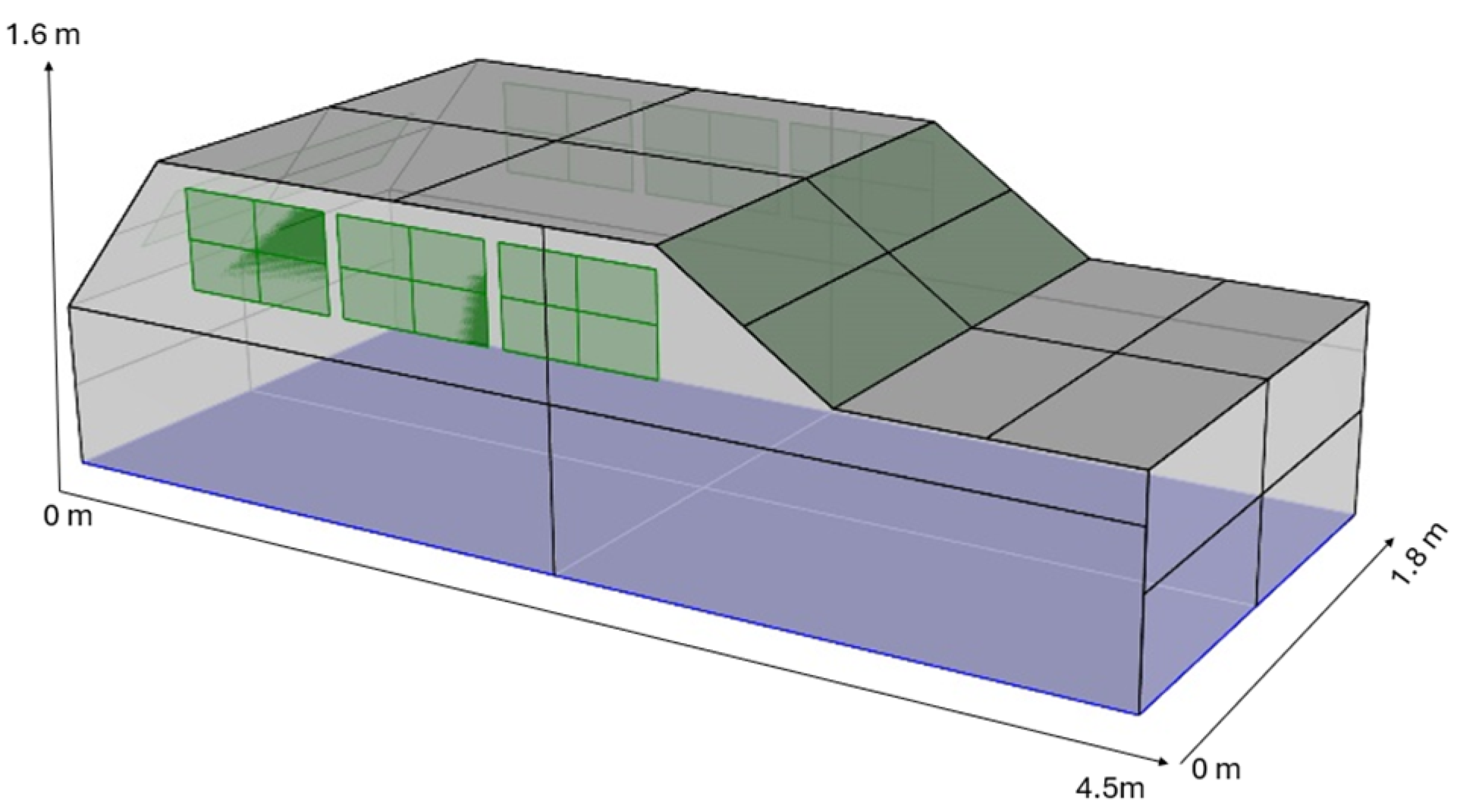 The simulation domain included the full vehicle geometry (roof, bonnet, rear, sides) and immediate surroundings (asphalted surfaces only). To meet Honeybee meshing requirements, curvatures were simplified into a closed polygonal geometry (