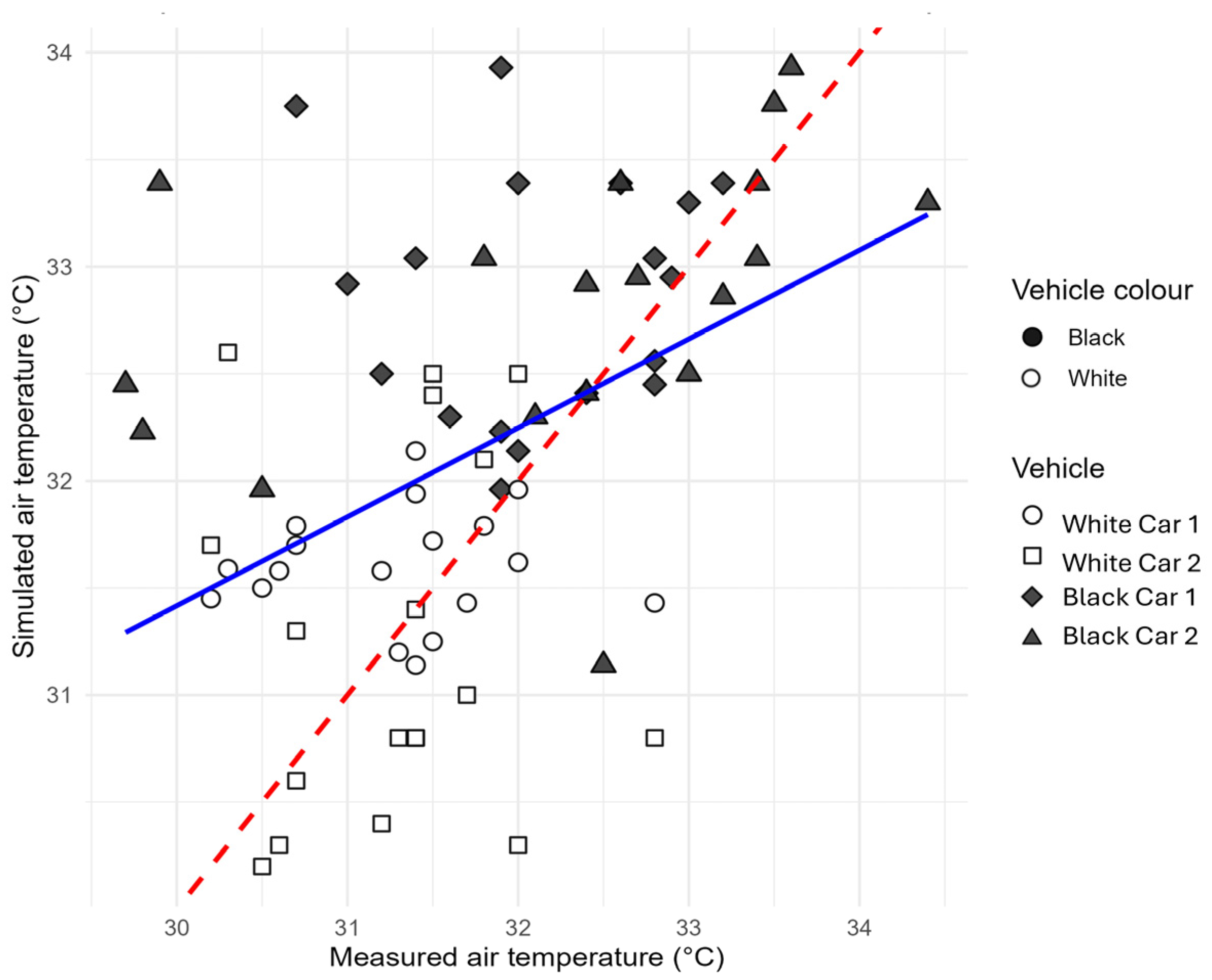 Figure 4. The scatter plot illustrates the relationship between simulated and measured air temperatures. While the model captures the overall magnitude of air temperature, as indicated by the general clustering of points within a similar temperature range, a substantial dispersion around the 1:1 line is observed. The fitted regression line deviates from the ideal 1:1 relationship, indicating that the model does not fully reproduce the variability in measured temperatures. This confirms that, although absolute errors remain relatively low, the model has limited ability to capture point-to-point spatial variability. This result supports the interpretation that the model is suitable for estimating overall temperature levels and relative differences between vehicle surfaces, but not for resolving detailed spatial variability driven by local radiative and aerodynamic processes.