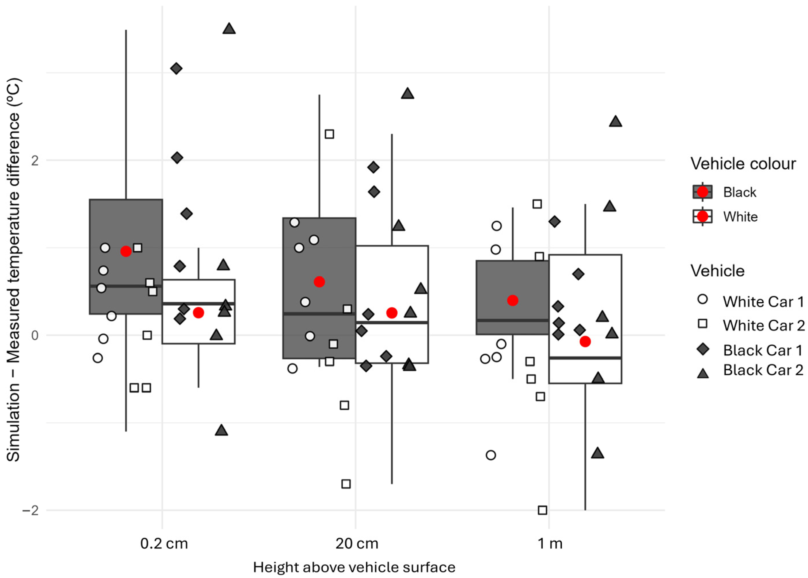 Figure 7. The model shows higher variability and larger dispersion of errors near black surfaces, whereas near white vehicles, deviations are smaller and more consistent. This suggests that radiative effects associated with darker surfaces may not yet be fully represented in the model’s parameterisation.
