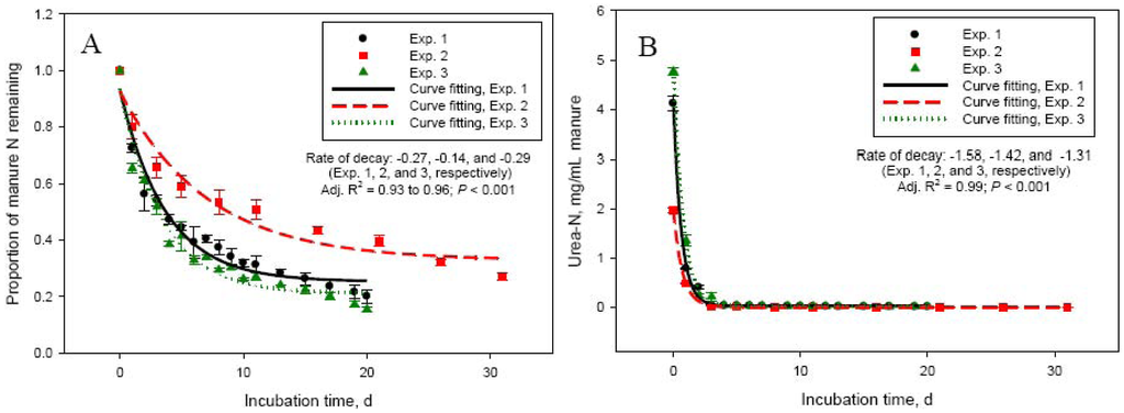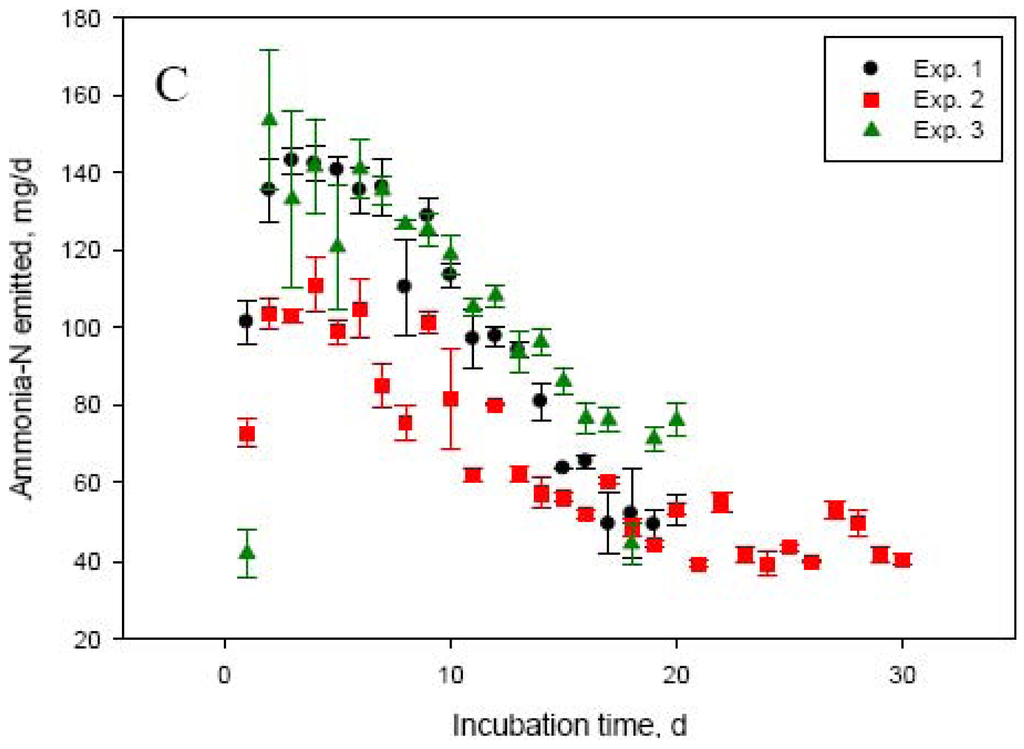 Dry matter and concentration of total and urea-N in manure used in this study varied significantly among experiments (Table 1). Manure N and specifically urea-N are important factors determining NH3-N volatilization losses from cattle manure [2]. Manure in Exp. 2 had about 50 to 60% lower (P < 0.001) urea- and total-N concentrations compared with manure used in Exp. 1, 3, and 4. This led to significantly lower daily manure N losses in Exp. 2, compared with Exp. 1, 3, and 4. The highest (P < 0.001) daily N losses were in Exp. 4, which can be explained by the shorter duration of this experiment (10 days), compared with the other experiments (20 or 30 days). The most rapid loss of manure N and most intensive NH3-N emissions occurred during the first 5 to 6 days (Figure 1A,C). This was matched by an equivalent rapid increase in NH3-N concentration in manure, reaching a peak at day 2 to 5. Initial concentration of ammonium in manure was negligible, but rapidly increased (to about 3 to 5 mg/mL manure) through day 5 in both Exp. 1 and 2 due to hydrolysis of urinary urea (data not shown). The much more rapid decline in manure urea-N concentration (Figure 1B) suggests that although urea hydrolysis took place immediately following mixing of feces and urine, NH3-N volatilization was a slower process. As shown in Table 1 and Figure 1 (Panels A and C), the quantity and intensity of manure N losses and NH3-N emissions were much lower in Exp. 2. As a proportion of manure N at day 0, N losses were similar (P > 0.05) between Exp. 1, 2, and 4, even though the duration of Exp. 2 was 30 days (compared with 20 or 10 days for Exp. 1 and 4, respectively). This again, emphasizes the importance of urinary urea-N concentration in the early stages of storage for the magnitude of NH3-N losses from manure. The daily NH3-N losses were the lowest (P < 0.001) in Exp. 2, but the highest as a proportion of manure N losses compared with the other experiments (Table 1). The lowest total recovery of manure N lost during the incubation was for Exp. 4, which had the shortest incubation length (10 days).