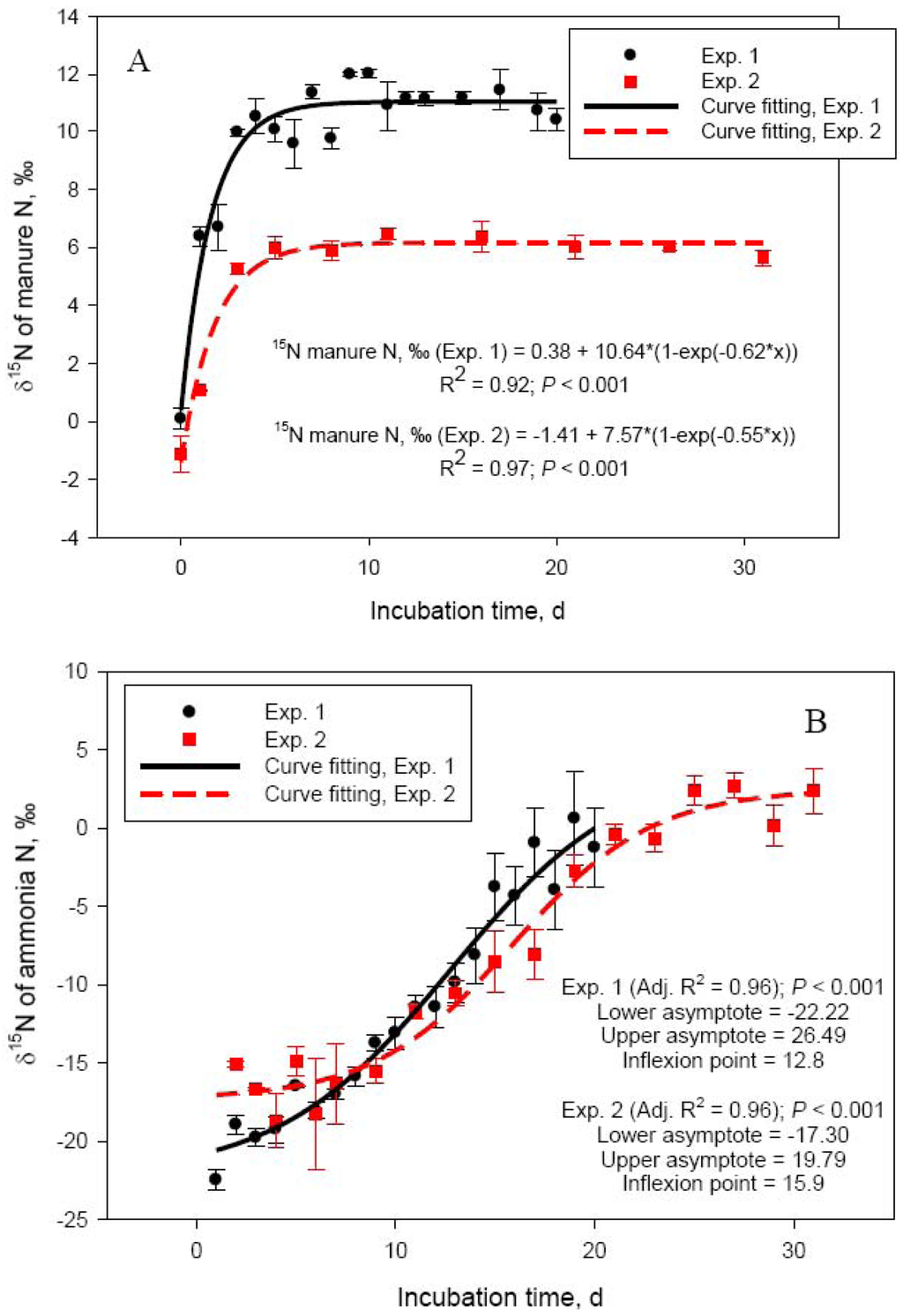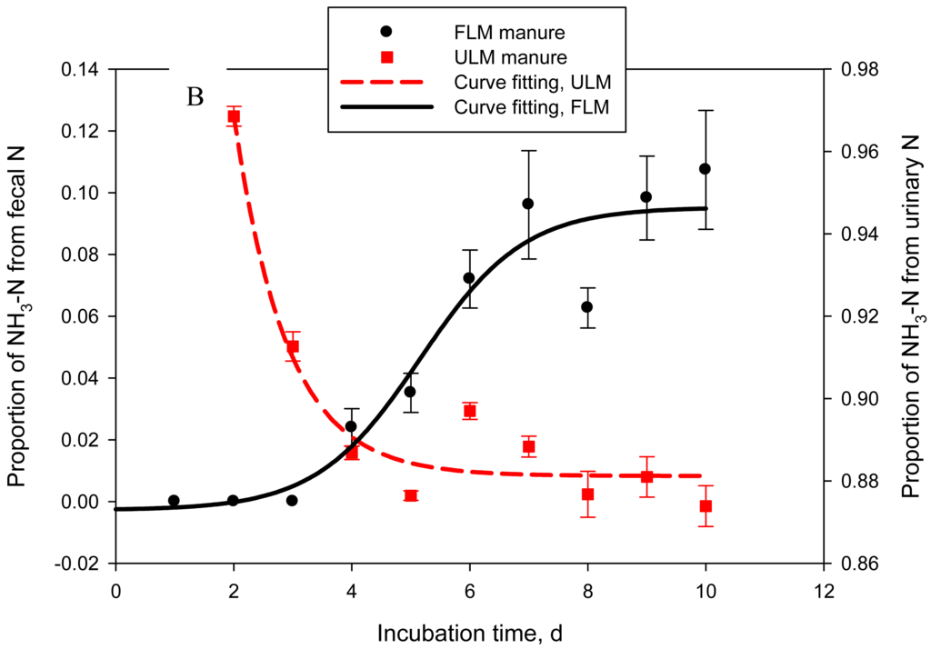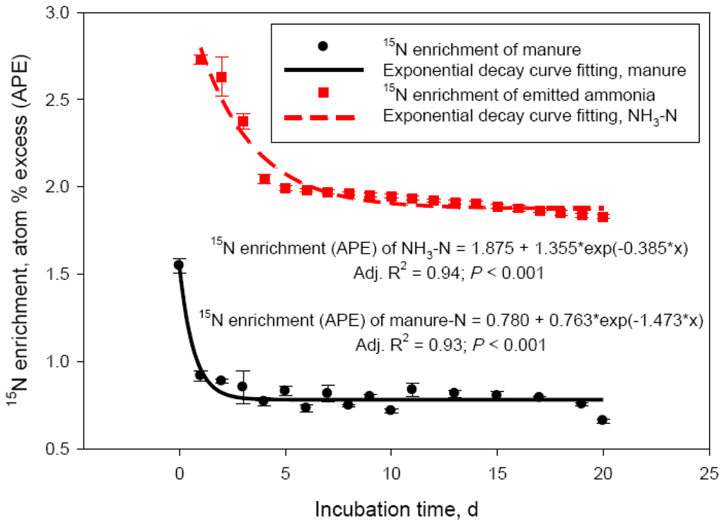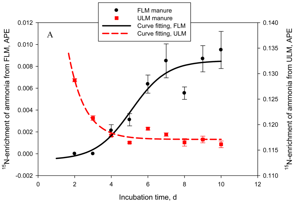 Delta 15N of manure rapidly increased from 0.09 ± 0.36 (day 0) to 10.1 ± 0.42 (day 5) in Exp. 1 and from −1.12 ± 0.61 (day 0) to 5.99 ± 0.40 (day 5) in Exp. 2 (Figure 2A). This rapid increase in δ15N was due to the loss of depleted in 15N NH3-N. Delta 15N of volatilized NH3 was −22.5 ± 0.68 on day 1 in Exp. 1 and −15.1 ± 0.17 on day 2 (day 1 measurement was lost) in Exp. 2 and increased to −16.5 ± 0.09 (day 5) and −1.3 ± 2.55‰ (day 20) in Exp. 1 and to −14.9 ± 0.90 (day 5) and 2.38 ± 1.45‰ (day 30) in Exp. 2 (Figure 2B). As hydrolysis of urea to ammonium (which as Figure 1B shows is a very rapid process), NH3-N volatilization, and N isotope fractionation take place, δ15N of NH3-N and the dissolved in manure ammonium will continue to increase until the ammonium is exhausted and the NH3-N obtains the δ15N value of the original ammonium. Indeed, as Figure 2B shows, δ15N of volatilized NH3-N continued to increase in a sigmoid fashion through day 30 of Exp. 2. The lower asymptote levels for both Exp. 1 and 2 indicated highly depleted in 15N NH3-N at the beginning of the manure storage process. The length of Exp. 1, however, was apparently too short to clearly observe the point of equilibrium visible in Exp. 2 (δ15N upper asymptote: 19.8‰). The inflexion point (i.e., the point of maximum rate of δ15N increase) was around day 13 and day 16 for Exp. 1 and Exp. 2, respectively. Delta 15N of manure reached a plateau beyond day 6 (Figure 2, Panel A), which coincided with the decline in NH3-N emission rates. Although changes in δ15N of manure parallel NH3-N losses, the dynamics of δ15N of NH3-N will likely make application of the N isotope approach for estimating manure NH3-N emissions difficult in practical farm conditions, which was our original goal [4]. Nevertheless, the relationship between manure δ15N and NH3-N volatilization losses appears to be linear in the initial stages of manure storage, when NH3-N losses are most intensive, and deserves further investigation.