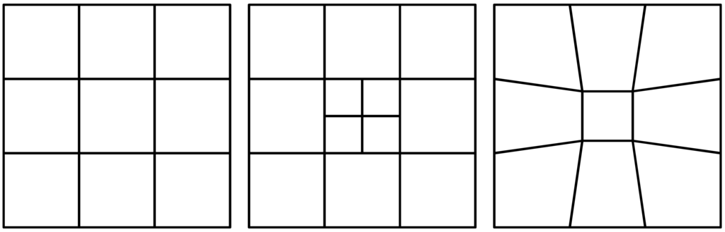 R-refinement techniques, commonly referred to as mesh moving or global refinement, relocate mesh nodes to regions warranting increased resolution and subsequently increase grid element concentration at the areas with the greatest inaccuracies. However, the total number of grid points is maintained constant. Unlike h-refinement, r-refinement around a region is necessarily accompanied by coarsening at another. Figure 1 shows simple schematics of h-refinement and r-refinement at the center of a simple nine element quadrilateral grid.