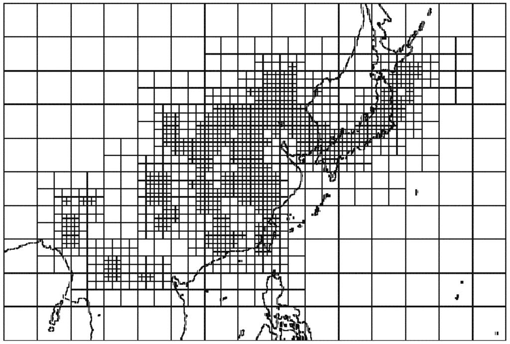 Nonetheless, future applications of adaptive gridding in air quality modeling may benefit from previous and ongoing efforts to integrate the technique into global models. Hubbard and Nikiforakis [37] applied the grid refinement technique of Berger and Oliger [19] previously explored in regional weather modeling, to global atmospheric modeling. Adaptive grid climate modeling on unstructured triangular or tetrahedral based grids has been explored by Behrens et al. [38–41]. Here, adaptation is achieved by bisecting triangular or tetrahedral elements. Jablonowski et al. [42–44] explored block-structured adaptive gridding within a global atmospheric model. The grid refinement technique implemented in these applications is similar to that applied to air quality modeling by Constantinescu et al. [24] and is illustrated in Figure 6. Refinement is achieved by organizing the domain into a block structured two-dimensional grid and further dividing blocks tagged for refinement into smaller self-similar units containing a fixed number of cells. Adaptation is allowed to proceed for several levels and each block is solved independently. A refinement technique applicable to three-dimensional grids based on any geometric element was described by Weller and Weller [45]. The method has been explored on reduced latitude-longitude and hexagonal icosahedral grids [45], cubed sphere and triangular icosahedral grids [46], and polygon based grids [47]. Moreover, an interesting approach to adaptation was presented by Weller [47] where future refinement requirements are predicted at each adaptation step, allowing less frequent grid restructuring and diminished costs associated with restructuring the grid. Predictions are attained by advancing the solution by one adaptation time step on a coarse grid and estimating refinement criteria from this solution to generate a refined grid effective for the entire adaptation step. Additional research efforts exploring atmospheric modeling with unstructured Voronoi tessellations and C-grid discretization have been recently reported [48,49]. These grid generation techniques provide a natural framework for multiscale modeling and could effortlessly incorporate adaptive gridding in the future.