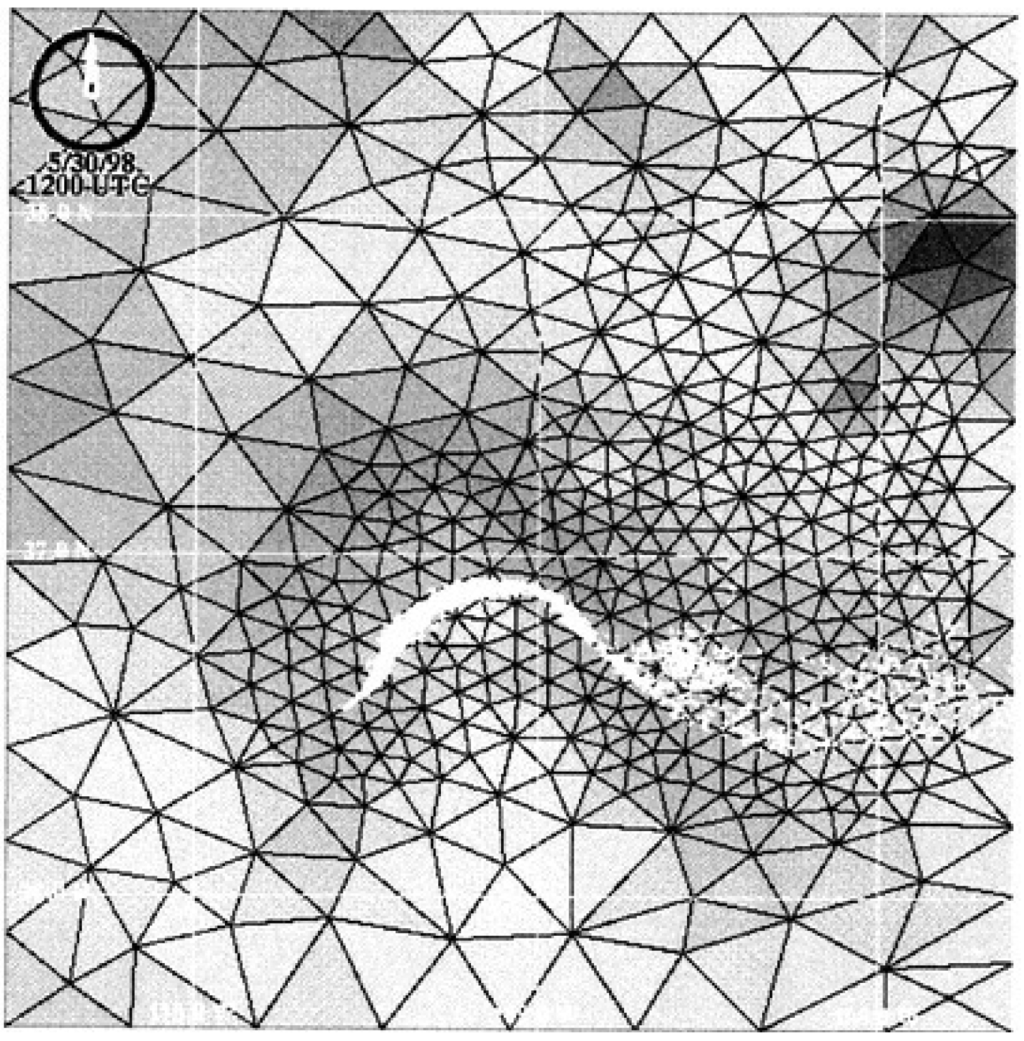 As adaptive grid modeling is being explored in air quality modeling, concurrent efforts to integrate the technique into weather prediction and global circulation models have been reported. Attempts to apply adaptive grids in comprehensive meteorological models have been limited with few recent developments. A noteworthy application is the Operational Multiscale Environmental model with Grid Adaptivity (OMEGA) [35]. This numerical weather prediction model operates on a three-dimensional unstructured grid constructed from triangular prisms. Adaptation is carried out by adding or removing vertices at the centroids of cells tagged for refinement, subdividing cells, and restructuring node connections to minimize aspect ratio. An interesting feature of the model is the addition of dispersion modeling. Three distinct atmospheric dispersion techniques are integrated into OMEGA: Eulerian, Lagrangian particle, and probabilistic puff modeling. The techniques simplify pollutant transport by relying on averaged wind fields, parameterizing turbulent diffusion, and neglecting chemical transformation processes. Although these methodologies are not new, their incorporation into an adaptive grid meteorological model is of interest. With their inclusion, OMEGA allows embedded dispersion models to operate under high resolution meteorological fields. Furthermore, adaptation of the meteorological model can be driven by the pollutant plume itself [35]. Figure 5 illustrates grid adaptation to a plume in OMEGA. In this manner, a coupled meteorological-air-quality model that continuously exchanges data to drive the adaptation is established.