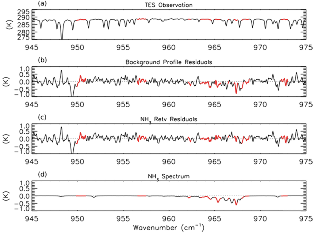 Biomass burning is a significant source of NH3 [15]; other anthropogenic sources are livestock and chemical fertilizers, while natural sources include oceans, wild animal respiration, and soil microbial processes [16]. NH3 is an integral component of the nitrogen cycle. It can combine with acidic gases like H2SO4 and HNO3 to form secondary aerosol, which then can impact climate and human health. This reactivity leads to a very short lifetime (less than two weeks) and large temporal and spatial variability. Background summer ammonia mixing ratios in the United States can range from 0.05 to 47 ppbv [17]. In situ observations of atmospheric ammonia are sparse and infrequent, making satellite observations of tropospheric NH3 highly desirable. Worden et al. derived molar ratios of NH3 to CO in smoke plumes from forest fires near San Luis Obispo, California, on 15 August 1994 using the Airborne Emission Spectrometer (AES), the airborne prototype for TES [18]. Beer et al. reported the first satellite observations of boundary layer NH3 using the TES instrument aboard Aura [19]. Shephard et al. extended this work to a detailed strategy for retrieving NH3 using TES [20]. Pinder et al. showed that the TES NH3 retrievals were able to capture the spatial and seasonal variability of NH3 over eastern North Carolina and that the retrievals compared well with in situ surface observations of NH3 [21]. In addition, Clarisse et al. have used the nadir viewing IASI instrument to retrieve mixing ratios and global distributions of tropospheric NH3 [10,22].