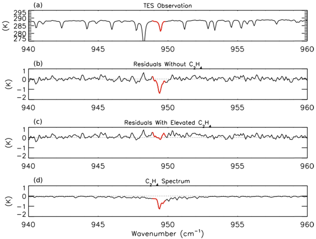 A similar procedure was used to detect C2H4 in TES spectra, with the addition that the surface emissivity, surface temperature, and NH3 profile were taken from the final results of the NH3 retrieval described in Section 2.2 above. The line parameters for C2H4 were taken from v1.4 of the TES spectroscopic line parameters.
