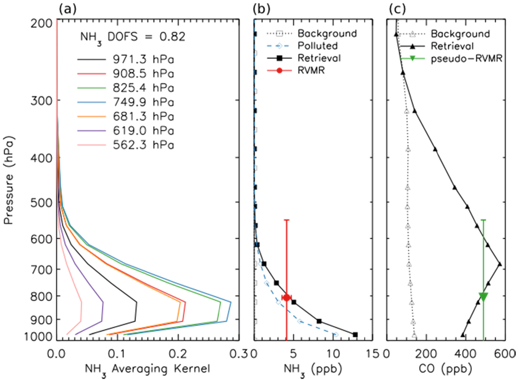 Figure 2a shows the averaging kernel for the same NH3 retrieval. The retrievals are performed using 14 vertical levels. However, the number of DOFS is generally not greater than one, meaning that it is not possible to obtain information about the shape of the profile from these retrievals. In order to minimize the influence of the a priori constraints on the end result, it is desirable to report one retrieved quantity per DOFS. However, performing a “profile” retrieval offers a major advantage in that us allows the calculation of diagnostics, such as the averaging kernels, that enable characterization of the spatial and temporal variability of the vertical sensitivity of the measurements. Therefore, for this work, the retrievals are performed on 14 levels in order to take advantage of the sensitivity characterization that this enables, then post-processed to calculate a single quantity that better represents the information that is really available in the measurement and that is relatively insensitive to the a priori constraints. Shephard et al. developed a Representative Volume Mixing Ratio (RVMR) metric for NH3 [20] based on similar techniques used previously for CH4 [51] and CH3OH [19]. This RVMR represents a TES sensitivity weighted average value where the influence of the a priori profile is reduced as much as possible. (Note that for NH3, one of three a priori profiles is selected based on the signal-to-noise ratio in the TES NH3 band [20]. For the scan shown in Figures 1 and 2, the polluted a priori, shown as a dashed blue line in Figure 2b, was selected.) Figure 2b shows a retrieved profile of NH3 for a fresh Canadian smoke plume as a solid black line, while the red circle is the RVMR calculated from the profile. The horizontal error bars show the uncertainty in the RVMR due to noise in the TES spectrum, while the vertical bars encompass the region of TES sensitivity to NH3, defined as the full width at half maximum (FWHM) of the averaging kernel at the pressure level of the RVMR [20]. With the a priori assumption about profile shape that was chosen here the NH3 RVMR is roughly 20% to 60% of the retrieved surface value for NH3. The estimated minimum detection level is an RVMR of approximately 0.3 ppb, corresponding to a profile with a surface mixing ratio of about 1–2 ppb [20]. However, it must be noted that this is merely a general estimate of the minimum detection level, which depends strongly on the location of peak NH3 mixing ratio and the thermal structure of the atmosphere for a given scan [20], and thus retrieved NH3 RVMRs of less than 0.3 ppb are considered valid and are included in our analysis.