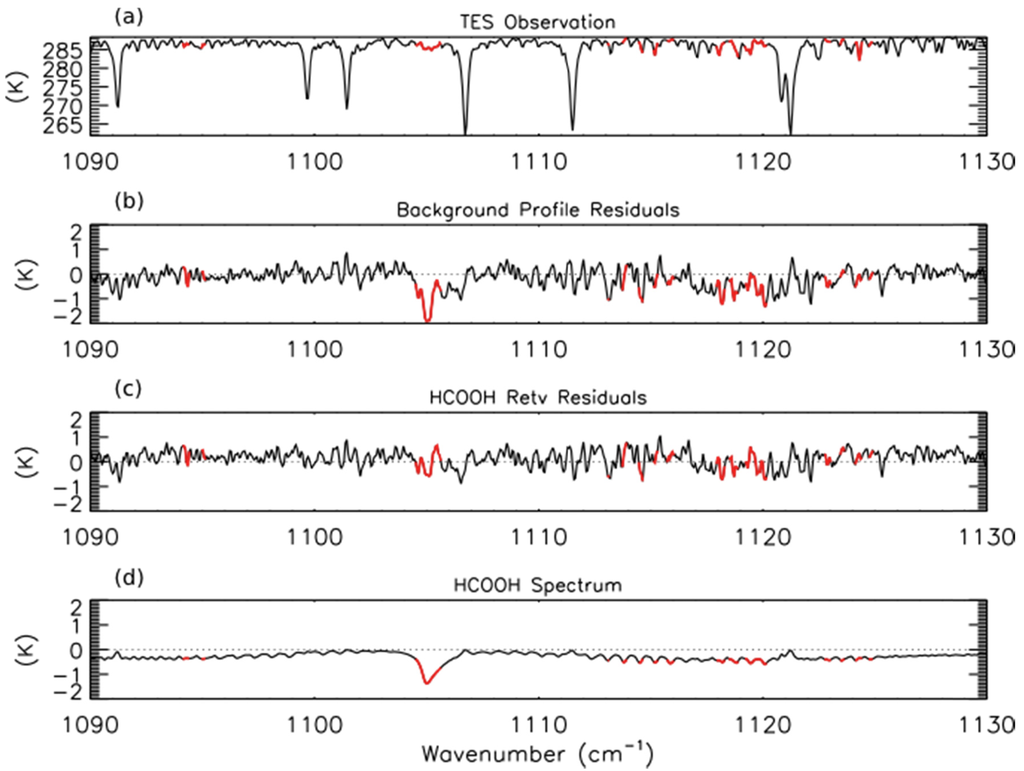 We have developed a prototype retrieval for formic acid (HCOOH) from TES Level 1B spectra. The retrieval approach is similar to that used for NH3. The spectroscopic parameters for HCOOH were taken from the HITRAN 2008 database, which substantially improved the estimates of the strengths of HCOOH lines by removing interference from the formic acid dimer [52]. All other spectroscopic parameters were taken from v1.4 of the TES spectroscopic line parameters [53]. The a priori constraint and covariance matrix were compiled from GEOS-Chem model simulations of the 2004 global background mixing ratios of HCOOH; however, these background profiles may be biased low, as GEOS-Chem tends to underestimate HCOOH in the northern mid-latitudes [28]. For HCOOH, the initial guess profile is the same as the a priori constraint vector. LBLRTM was run using TES Level 2 (V004) retrievals of temperature, average cloud optical depth, emissivity, reflectivity, H2O, CO, O3, and CH4. Profiles of CO2 and N2O were taken from the TES Level 2 supplemental data files. The top panel of Figure 3 shows the observed TES brightness temperature spectrum between 1090–1130 cm−1 for a scan of fresh smoke from a Canadian fire with the HCOOH retrieval microwindows shown in red. Note that only some sections of the HCOOH band have been retained in order to remove interfering lines from other species, principally water vapor. The second panel shows the residuals (observed spectrum minus modeled spectrum) for the background HCOOH profile. We see a strong (−2 K) residual in the HCOOH Q-branch (∼1105 cm−1), which is removed after retrieval of HCOOH as seen in the third panel of Figure 3.